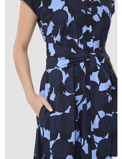 Cette robe midi couleur bleu horizon possède une encolure en V et des manches courtes. Elle est ceinturée par un lien ton sur ton à nouer au devant et possède une jupe volantée. Elle se ferme entièrement au devant par de petits boutons carrés bleu nuit. Elle est entièrement imprimée de notre motif "big cherry" pour un look ultra romantique.