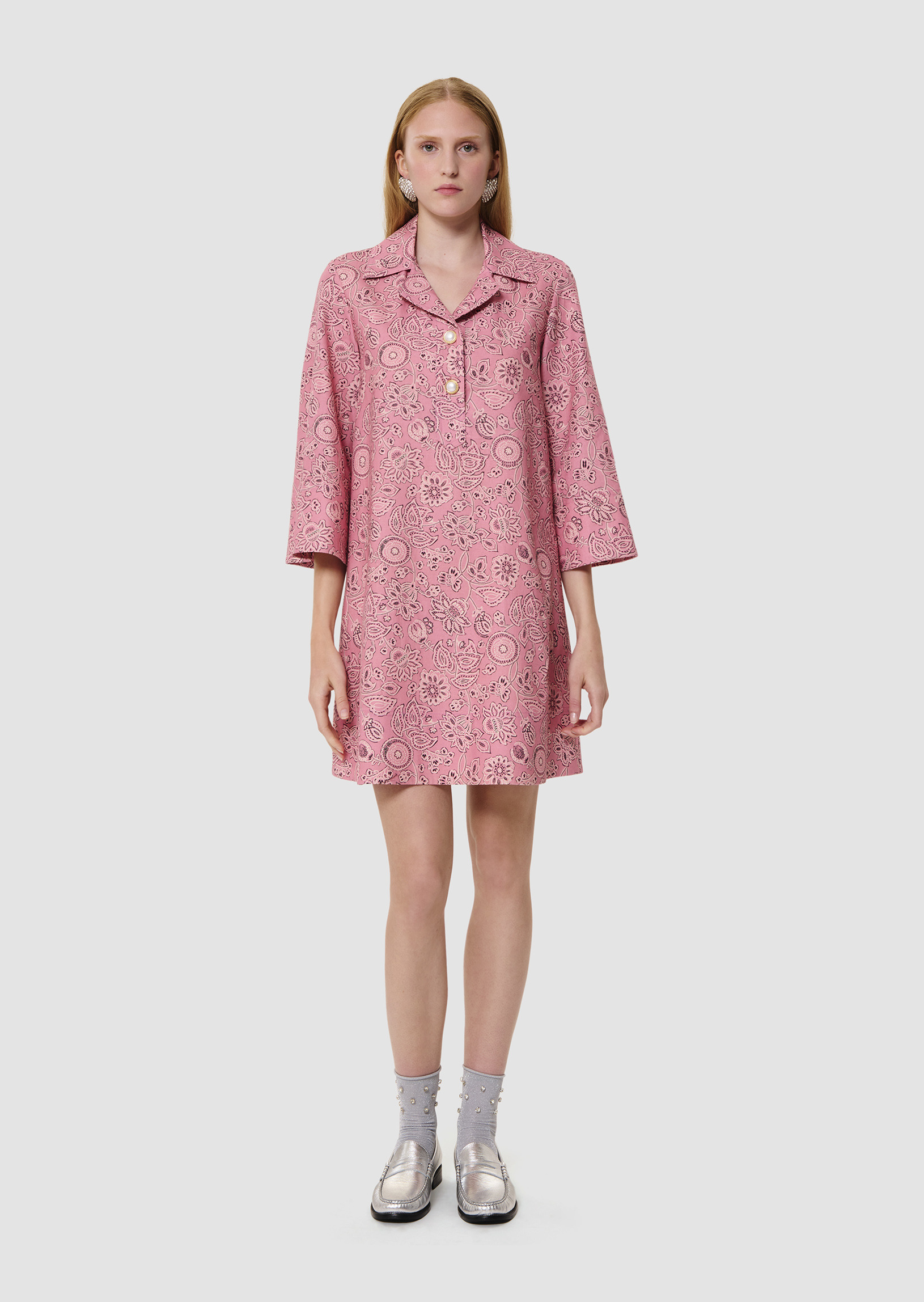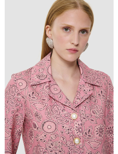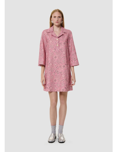 Cette robe courte droite motif bandana couleur bois de rose possède un col chemise et des manches 3/4 évasées. Sa coupe évasée se boutonne au col par deux boutons bijoux nacrés et dorés.