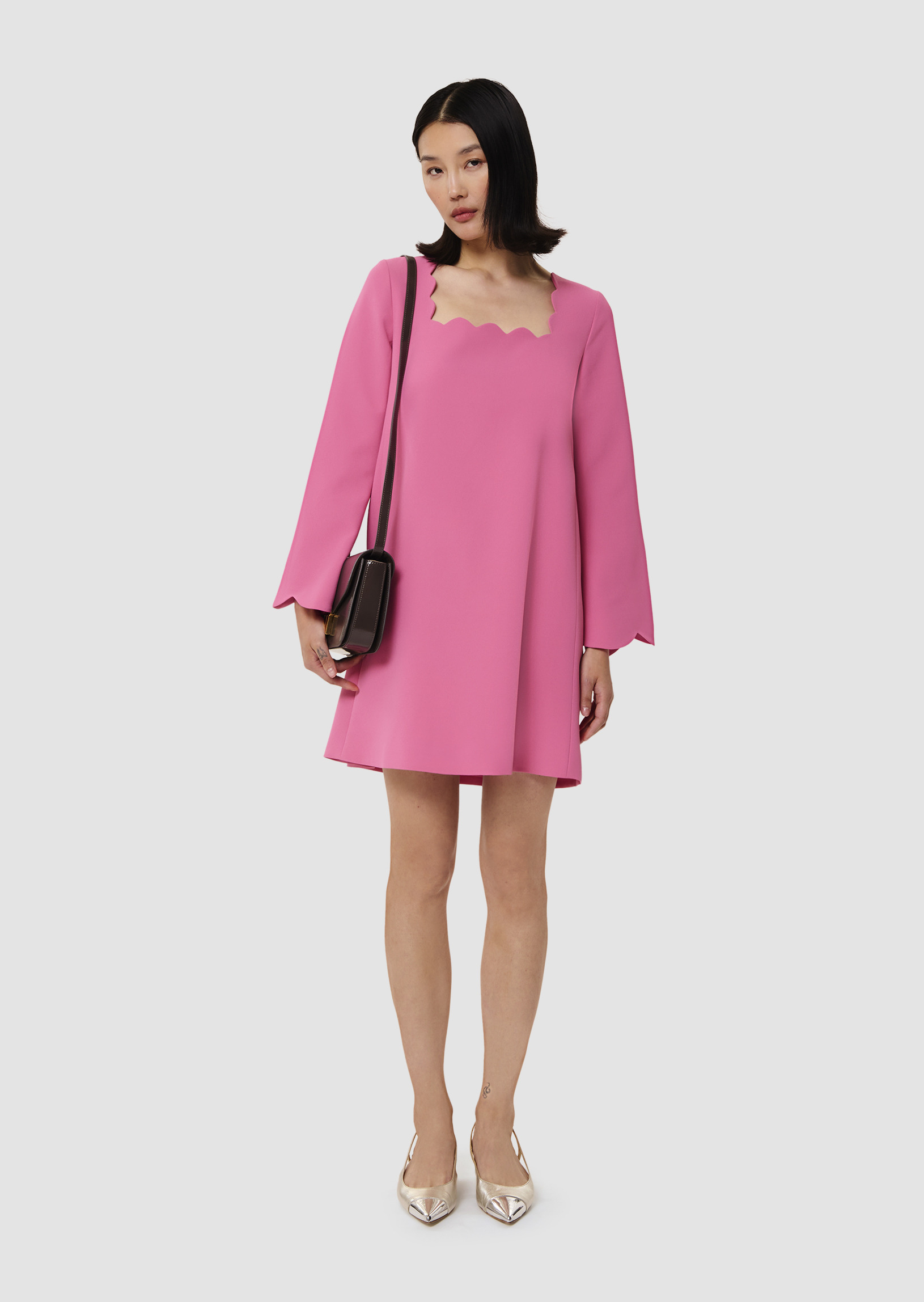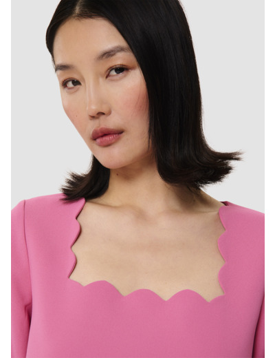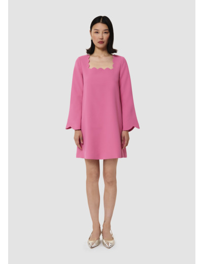 Cette robe courte rose en crêpe fluide possède une coupe légèrement trapèze, des manches évasées et une encolure carrée. Son côté preppy réside dans ses finitions festonnées au col et au bas des manches. Elle se ferme au dos par un zip invisible.