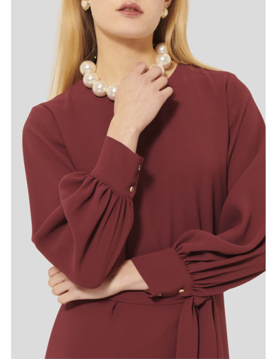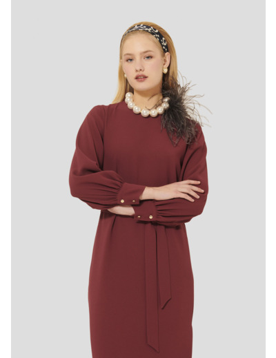 Cette longue robe fluide en crêpe couleur bordeaux possède une encolure ronde et des manches longues ballons boutonnées aux poignets. Elle est ajustable à la taille grâce à une ceinture ton sur ton amovible. Elle se ferme par un bouton ton sur ton au niveau de la nuque.