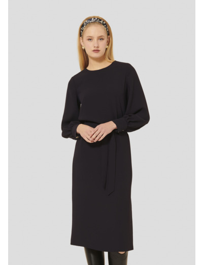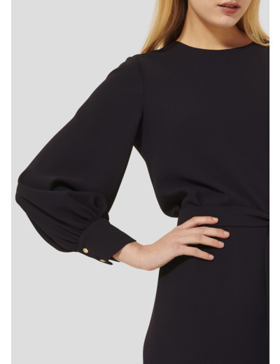 Cette longue robe fluide en crêpe couleur bleu nuit possède une encolure ronde et des manches longues ballons boutonnées aux poignets. Elle est ajustable à la taille grâce à une ceinture ton sur ton amovible. Elle se ferme par un bouton ton sur ton au niveau de la nuque.