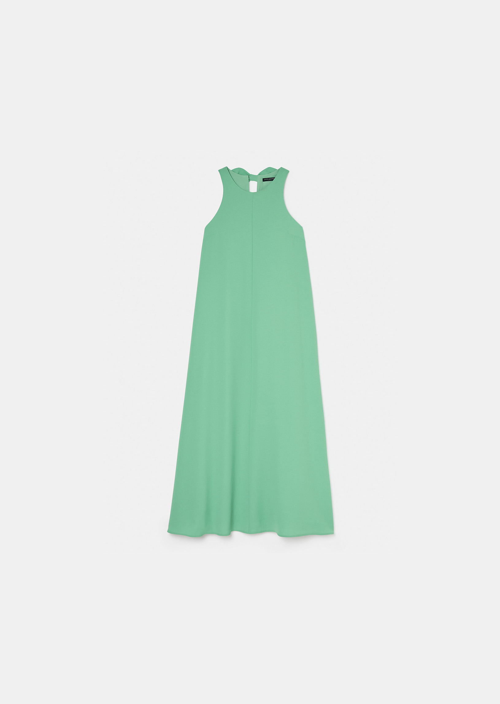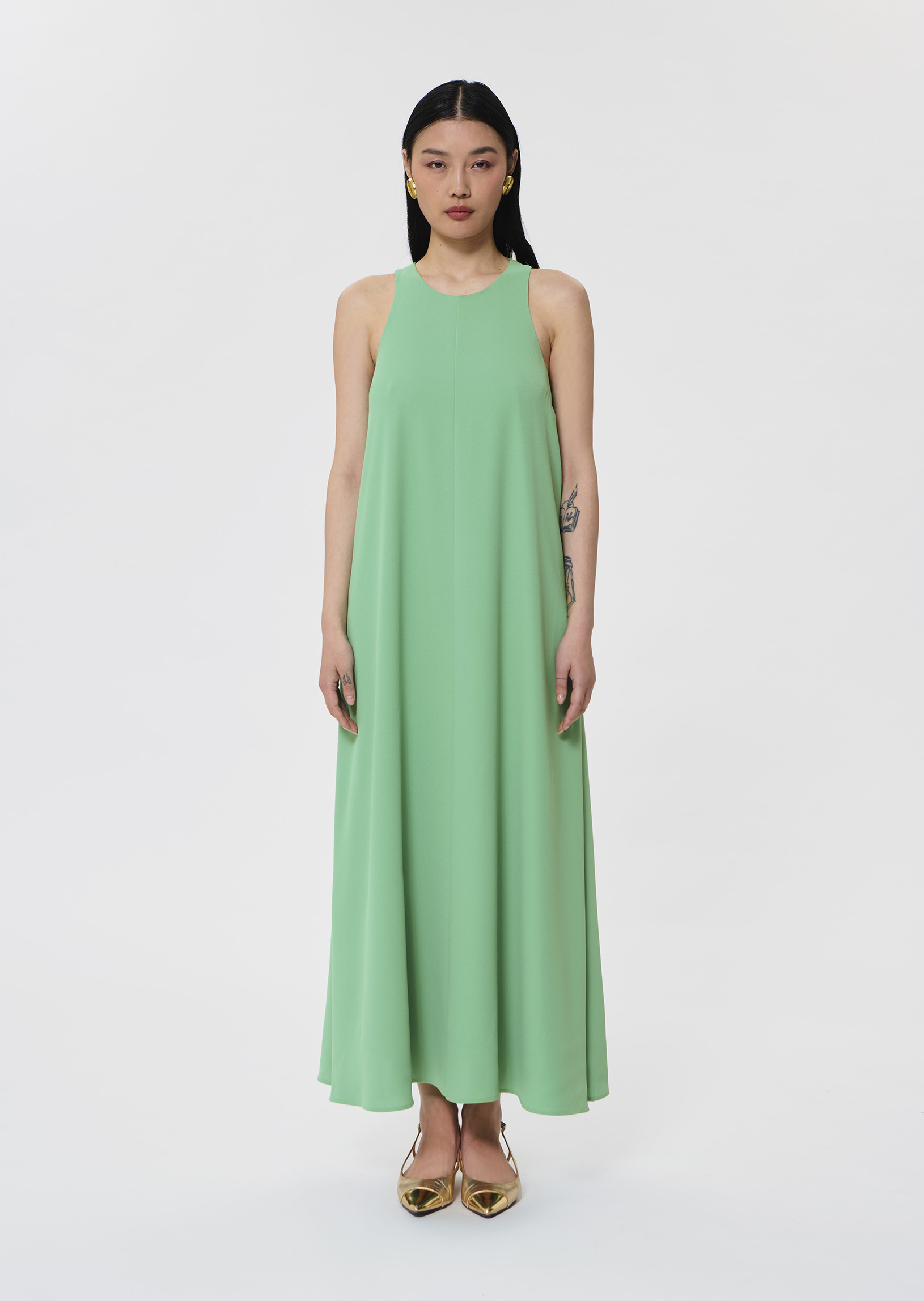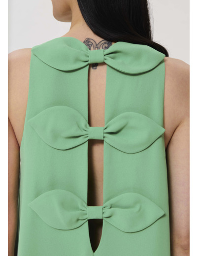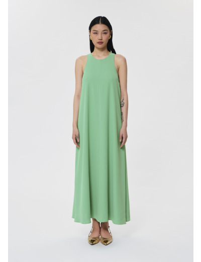 Cette longue robe sans manches en crêpe verte possède un col rond et une coupe ultra volantée au bas. Son twist, réside dans les détails ajourés au dos et ornés de larges nœuds ton sur ton. Elle possède des poches aux côtés et se ferme au dos à l’aide de petits boutons ton sur ton.