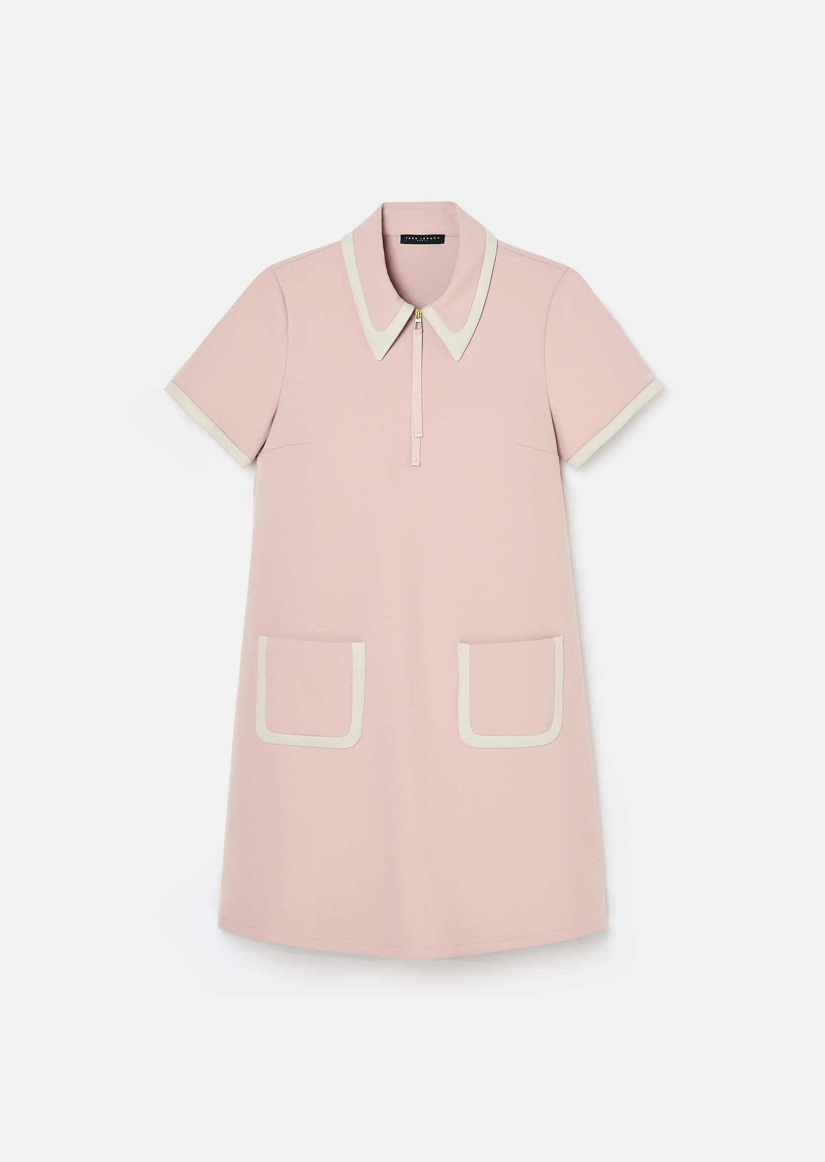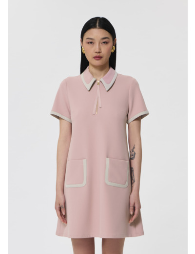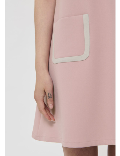 Cette robe courte couleur rose blush en toile double possède une coupe évasée, un col chemise, des manches courtes et deux poches plaquées ton sur ton aux côtés. Son originalité réside dans les empiècements écrus contrastant au niveau du col, du bas des manches et du contour des poches. Elle se ferme au-devant par un zip doré situé sous le col.