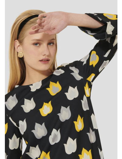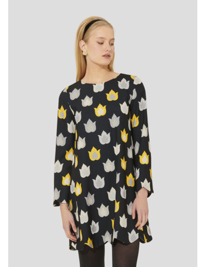Cette robe courte noire en crêpe reprend notre imprimé flammes. Elle possède des manches longues évasée et une encolure ronde. Sa coupe trapèze lui donne un esprit preppy et sa finition festonnée apporte une touche féminine supplémentaire. Fermeture par zip invisible dans le dos.
