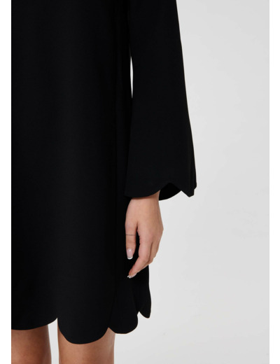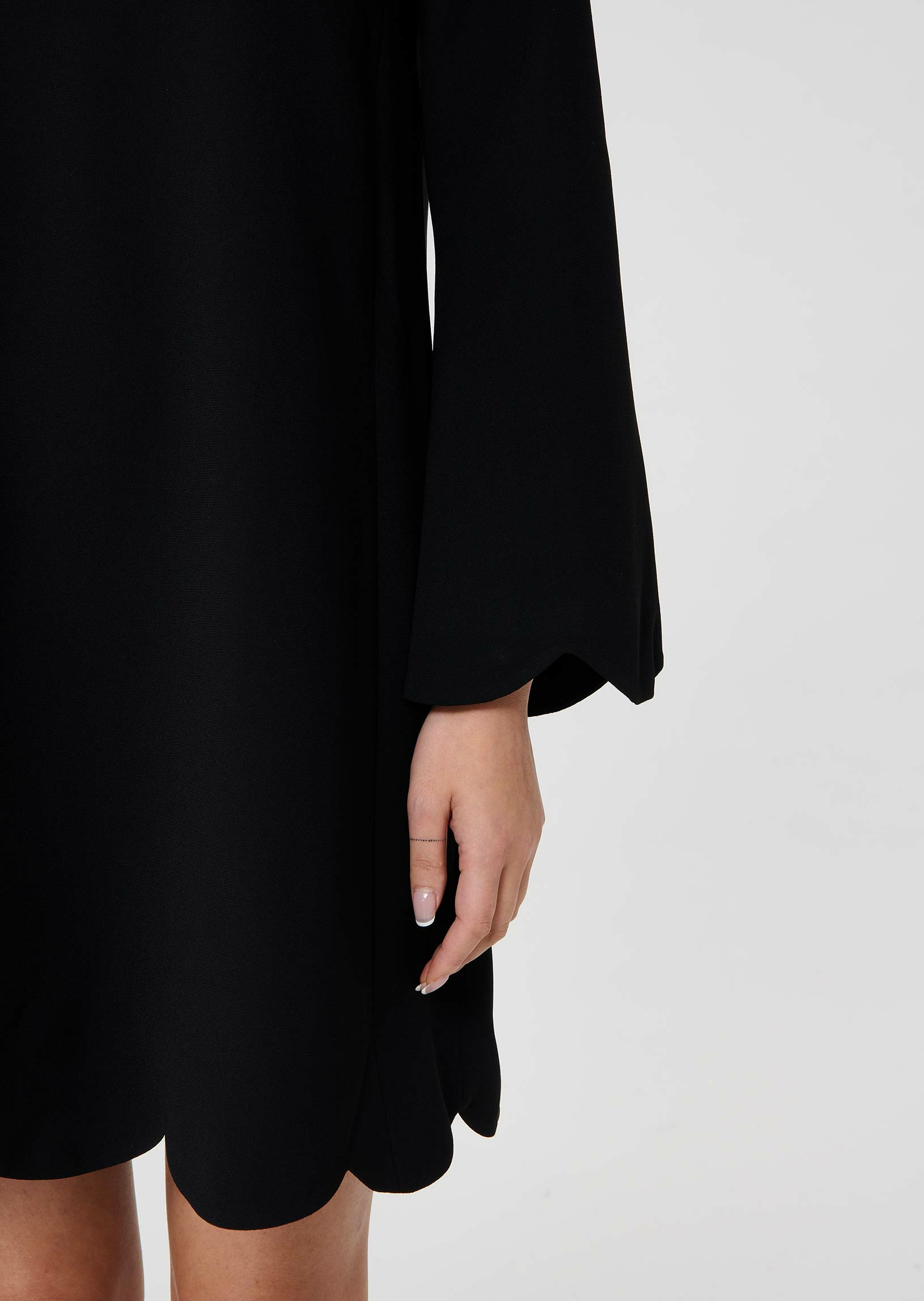 Cette robe courte noire en crêpe possède des manches longues évasée et une encolure ronde. Sa coupe trapèze lui donne un esprit preppy et sa finition festonnée apporte une touche féminine supplémentaire. Fermeture par zip invisible dans le dos.