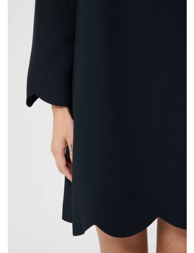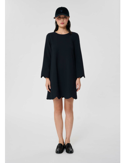 Cette robe courte couleur bleu nuit en crêpe possède des manches longues évasée et une encolure ronde. Sa coupe trapèze lui donne un esprit preppy et sa finition festonnée apporte une touche féminine supplémentaire. Fermeture par zip invisible dans le dos.