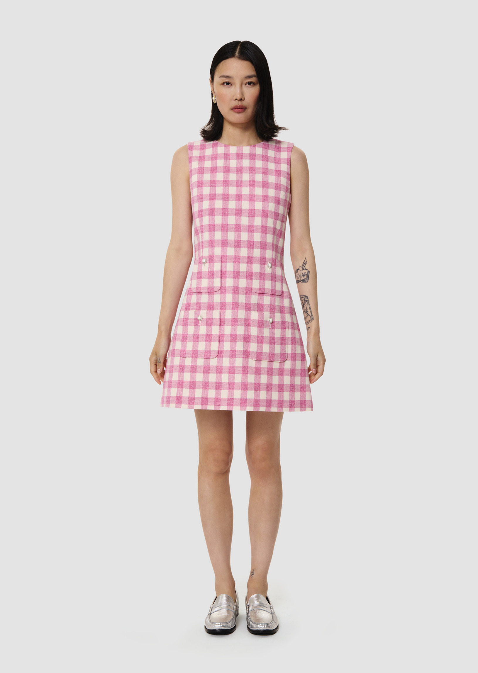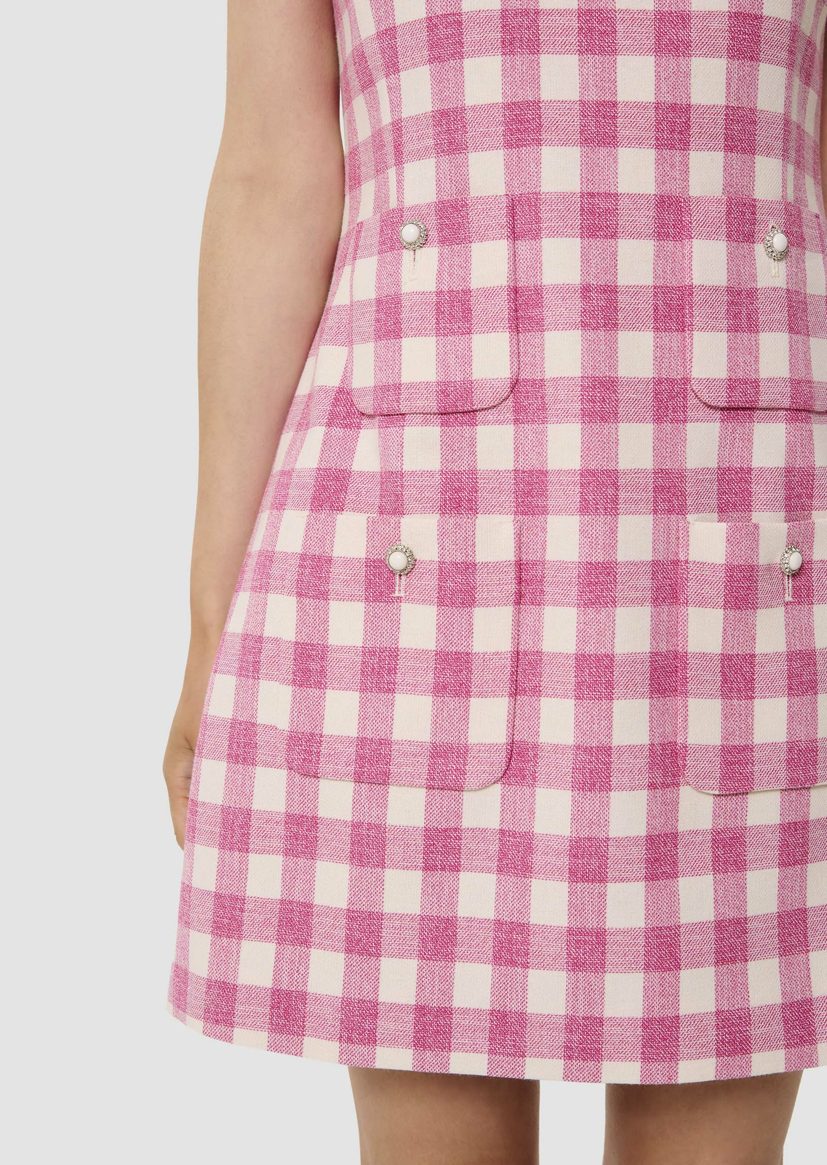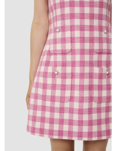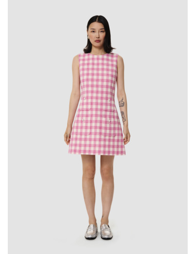 Cette robe courte sans manches à motif vichy écru et rose bonbon possède un col rond. Elle est cintrée à la taille et arbore une coupe trapèze ultra féminine. Son esprit 60's est apporté par ses quatre poches plaquées au devant décorées d'un bouton bijoux. Elle se ferme au dos par un zip invisible.