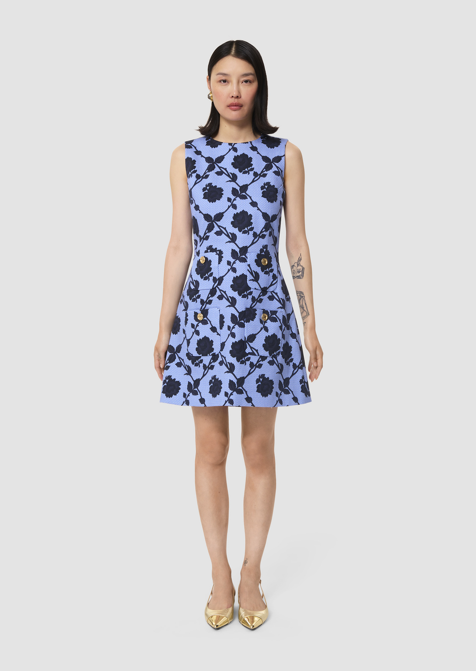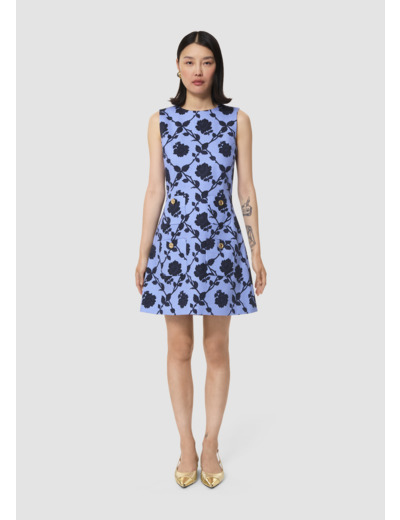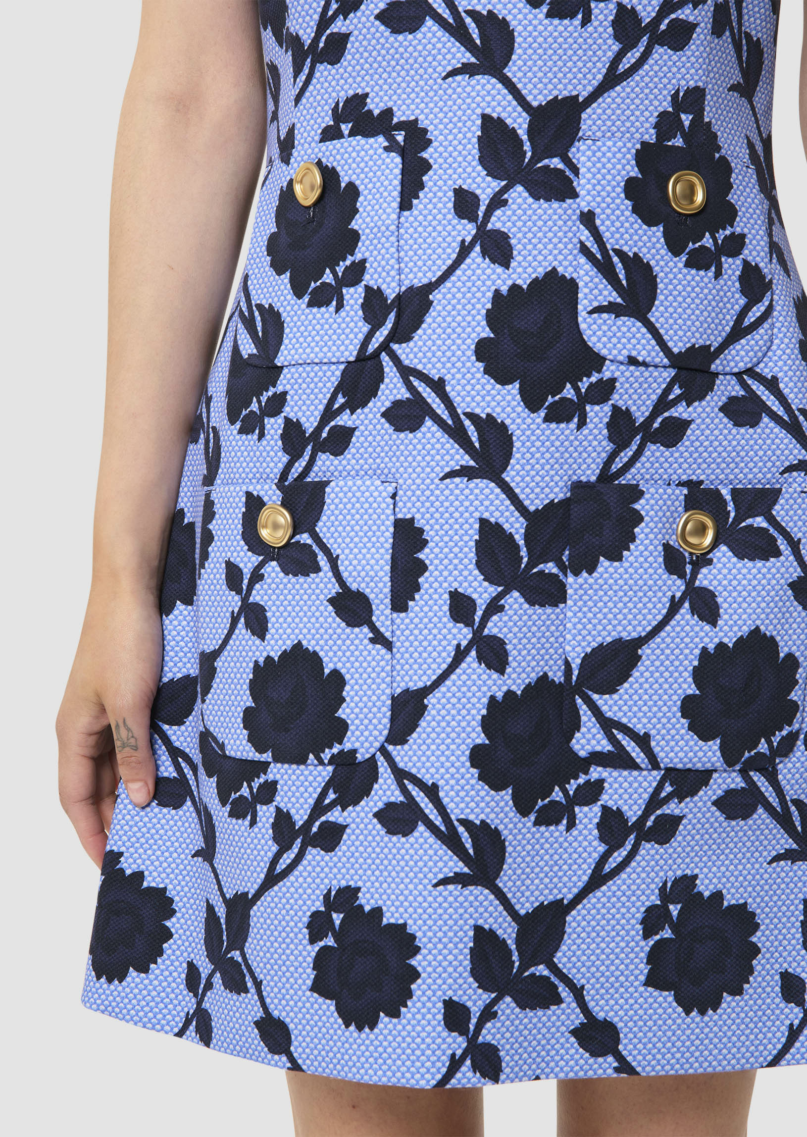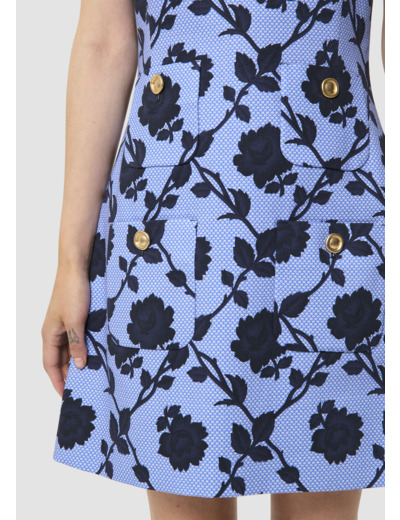 Cette robe courte sans manches couleur bleu horizon en toile caviar possède un col. Elle est cintrée à la taille et arbore une coupe trapèze ultra féminine. Son esprit 60's est apporté par ses quatre poches plaquées au devant décorées d'un bouton bijoux. Son twist réside dans son motif “rose garden” et la petite encolure en V dans le dos. Elle se ferme au dos par un zip invisible.