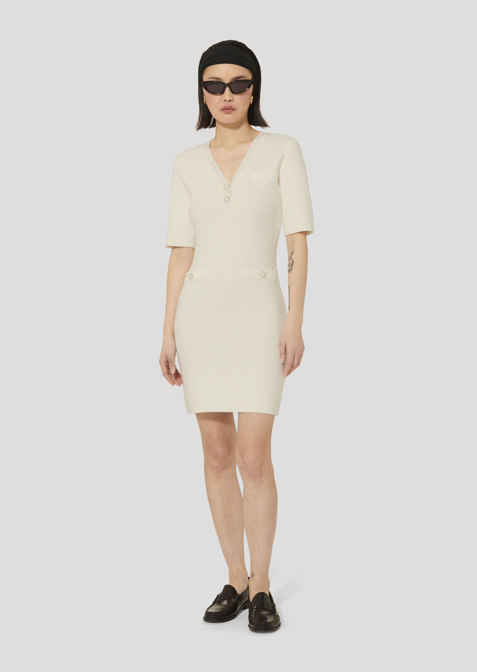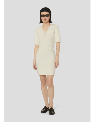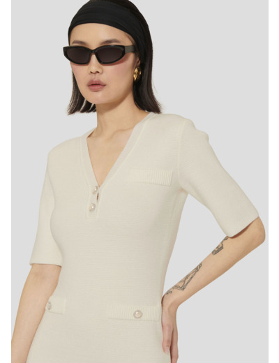 Cette robe écrue en maille possède une coupe près du corps, un col V et des manches 3/4. Elle possède deux poches aux côtés et une poche à la poitrine. Elle se ferme au-devant par deux jolis boutons perles nacrés sous le col, que l'on retrouve également au niveau des poches.