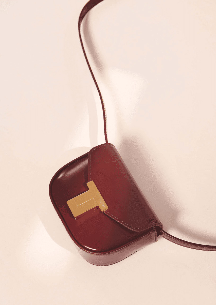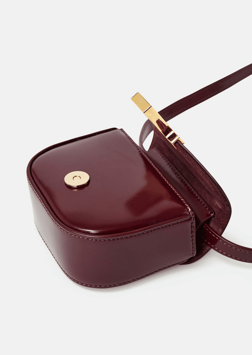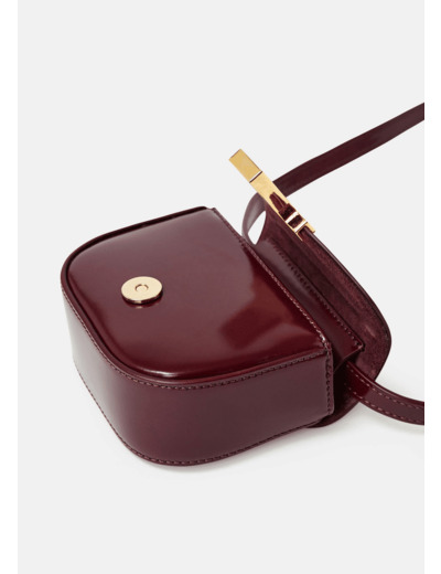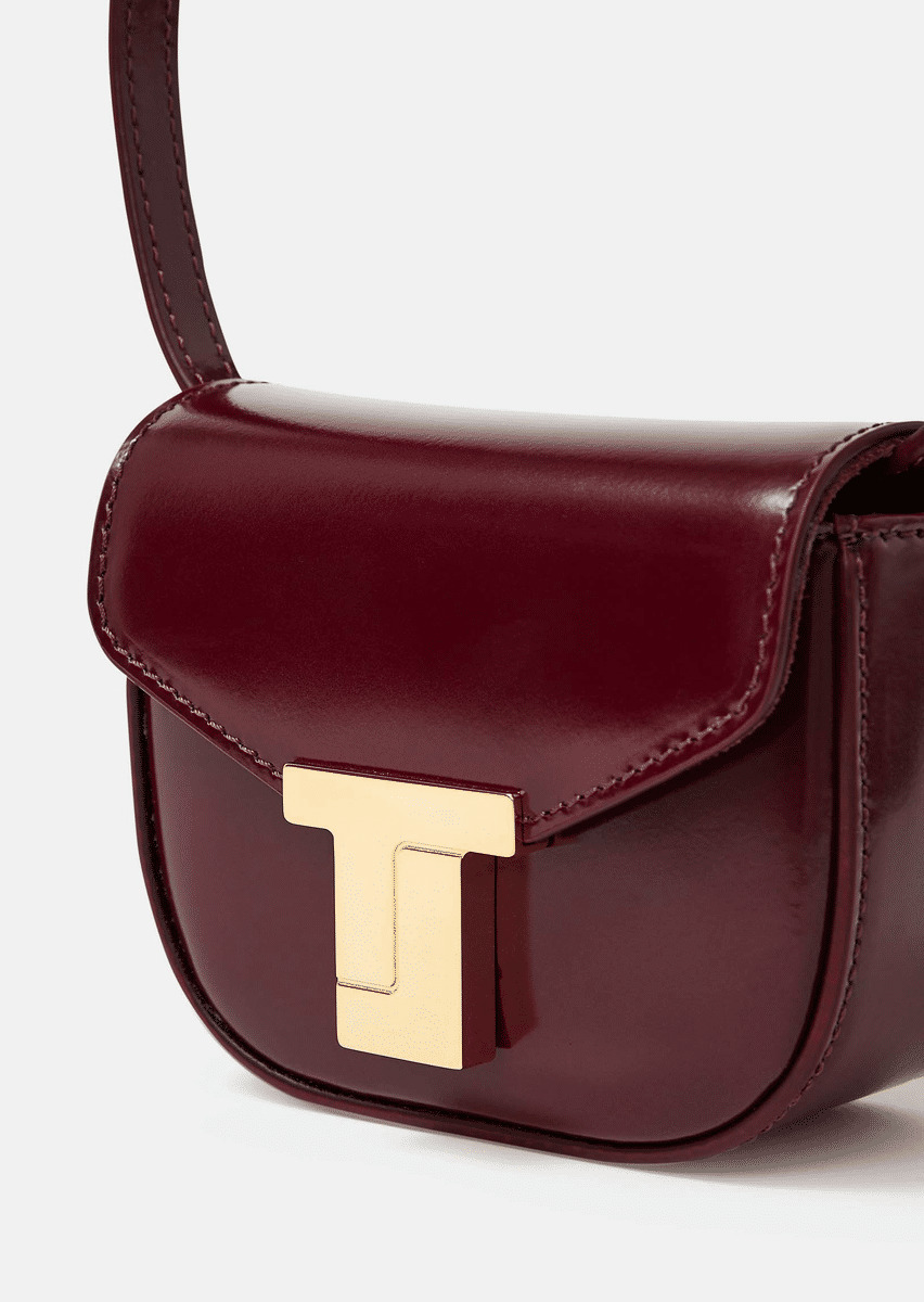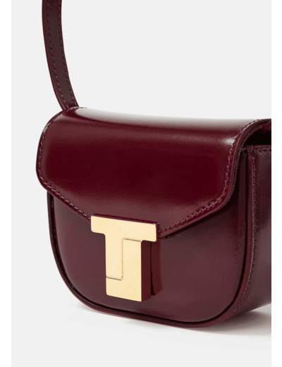 Fait en Italie, cette version mini du sac 8 Bis en couleur bordeaux est entièrement confectionné en cuir lisse. Il possède une bandoulière assortie amovible et réglable pour vous accompagner partout. Vous trouverez une petite poche à rabat à l'intérieur pour y ranger vos cartes. Fermeture par bouton pression au devant. Son fermoir doré arbore le nouveau monogramme de la maison Tara Jarmon.