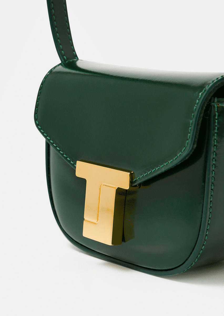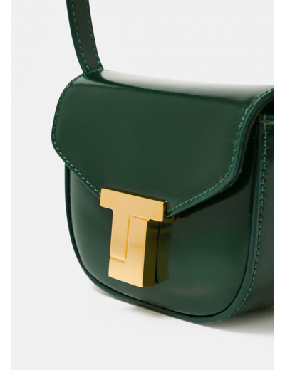 Fait en Italie, cette version mini du sac 8 Bis en couleur vert émeraude est entièrement confectionné en cuir lisse. Il possède une bandoulière assortie amovible et réglable pour vous accompagner partout. Vous trouverez une petite poche à rabat à l'intérieur pour y ranger vos cartes. Fermeture par bouton pression au devant. Son fermoir doré arbore le nouveau monogramme de la maison Tara Jarmon.