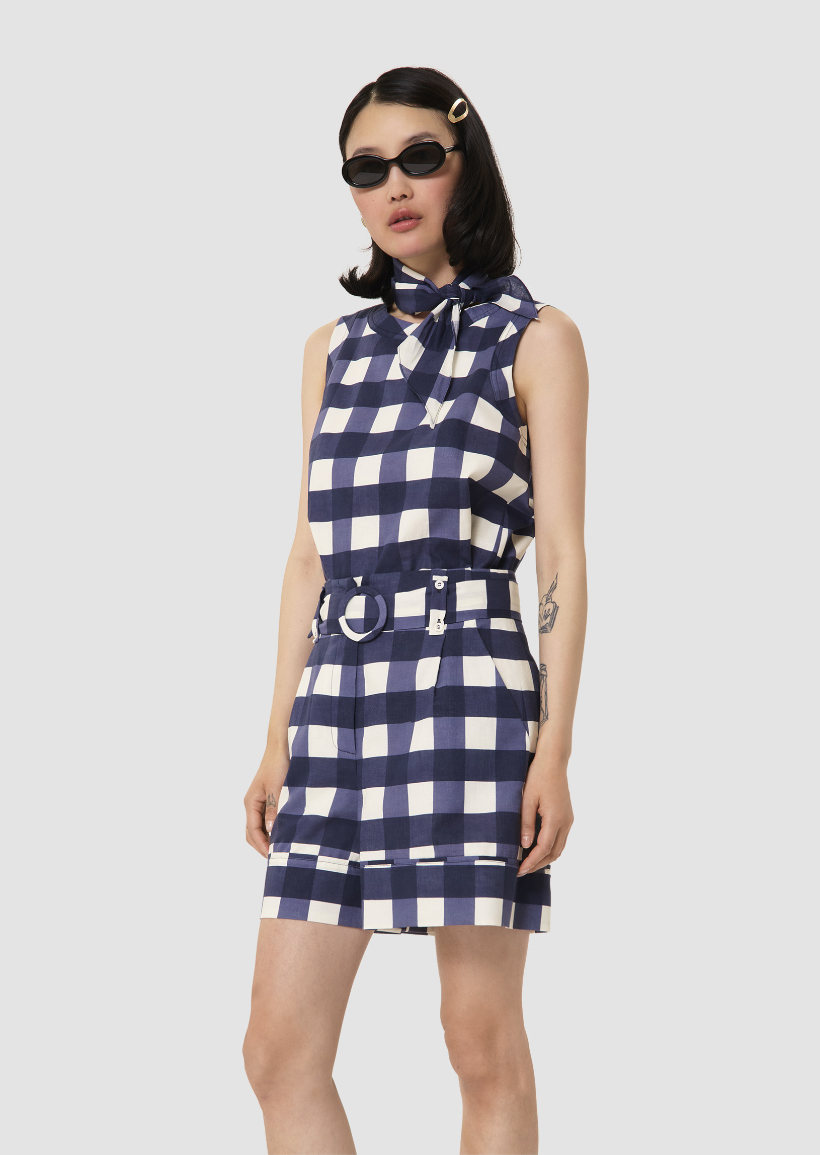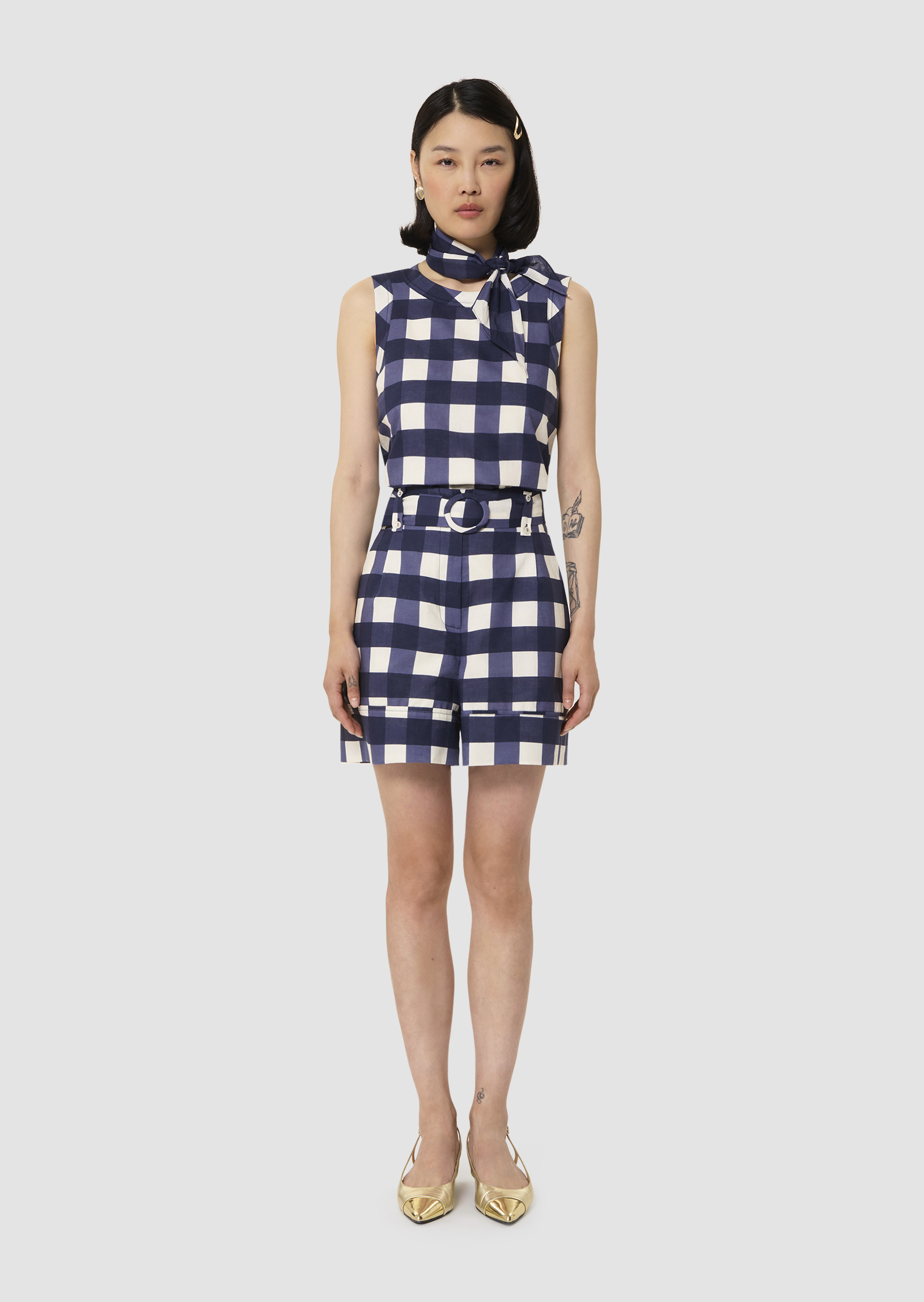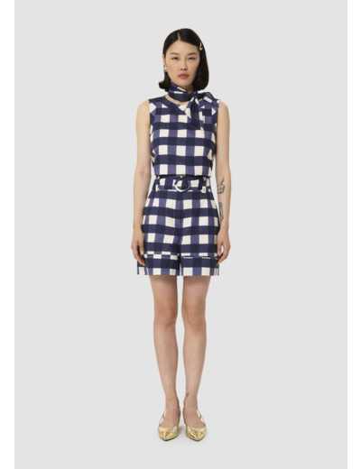 Ce short possède une coupe paperbag et une taille haute marquée d'un ceinture amovible ton sur ton à boucle. Ultra romantique, il est entièrement confectionné en gros vichy bleu nuit. Fermeture classique par zip et agrafe.