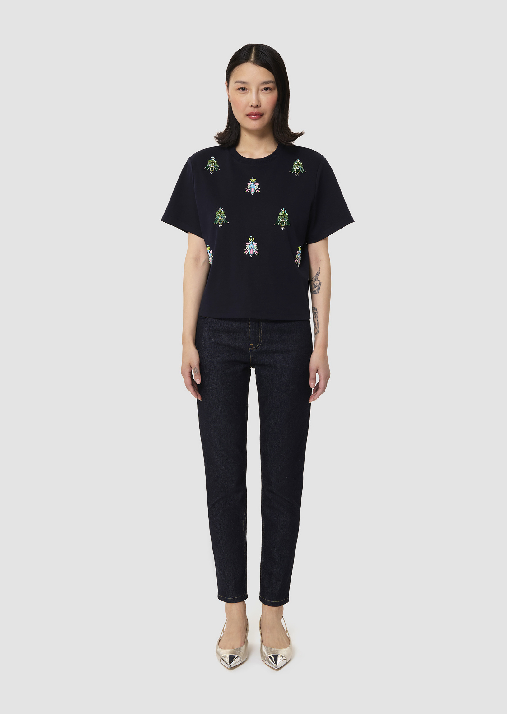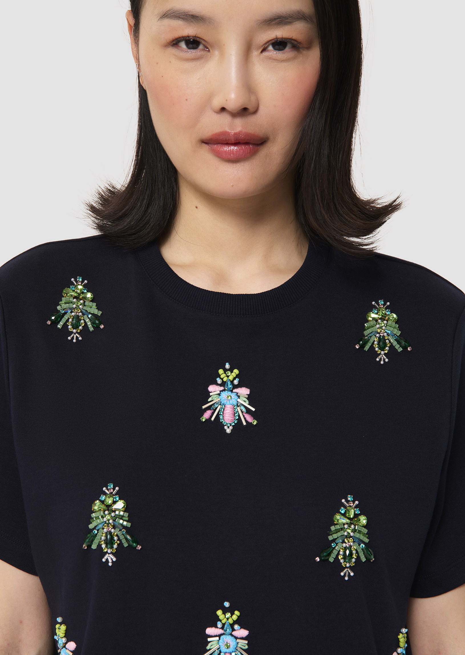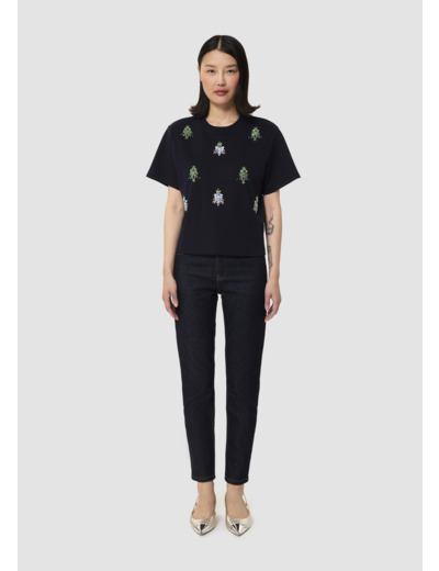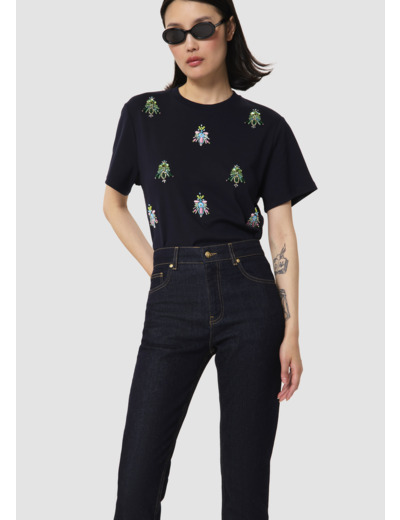 Ce t-shirt bleu nuit en jersey possède les codes classiques du t-shirt : un col rond, des manches courtes et une coupe droite classique. Son twist, so Tara, est apporté par ses motifs abeilles formés par des perles et des strass brodés au devant.