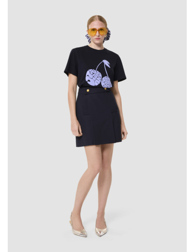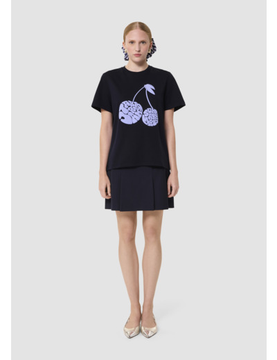 Ce t-shirt bleu nuit en jersey possède les codes classiques du t-shirt : un col rond, des manches courtes et une coupe droite classique. Son twist, so Tara, est apporté son message "Tara Jarmon Summer Market" formant une cerise XXL couleur bleu horizon.