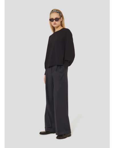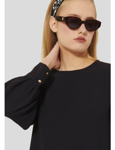 Ce haut bleu nuit en crêpe possède une coupe large, une encolure ronde et des manches longues boutonnées aux poignets. Il se ferme au niveau de la nuque par un bouton doré.