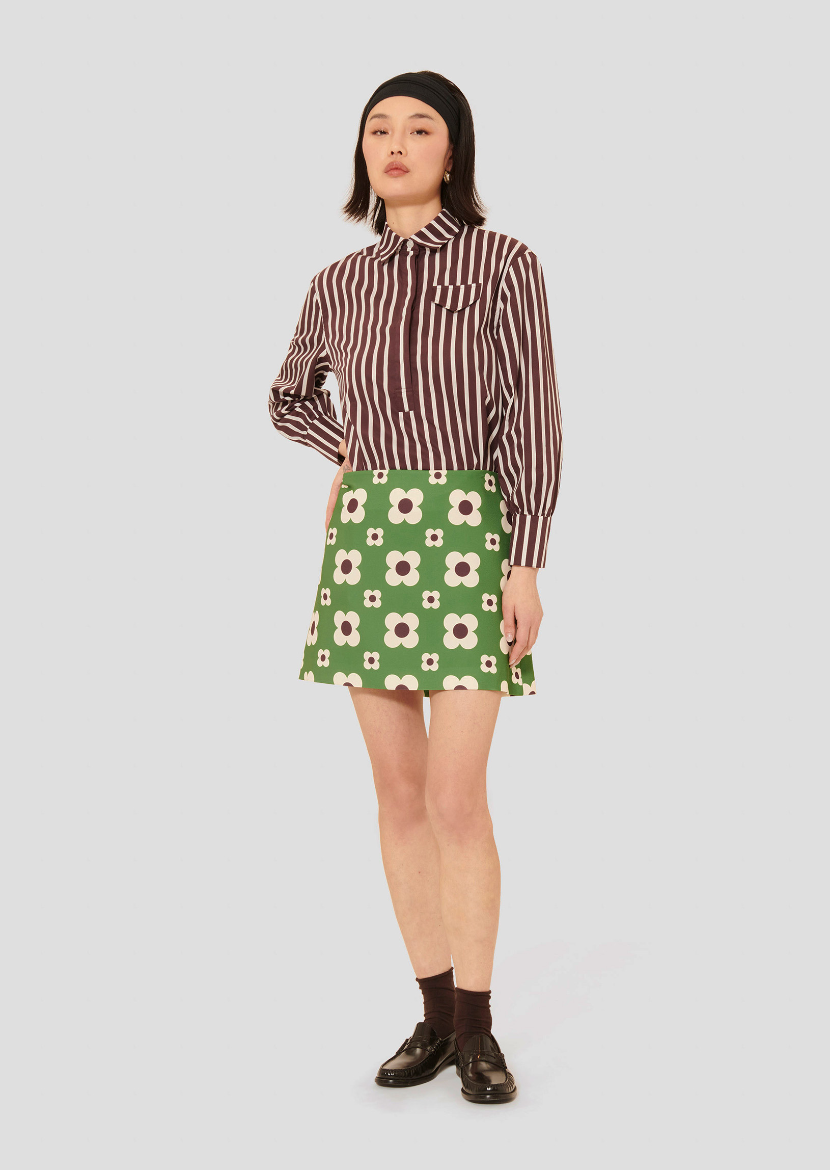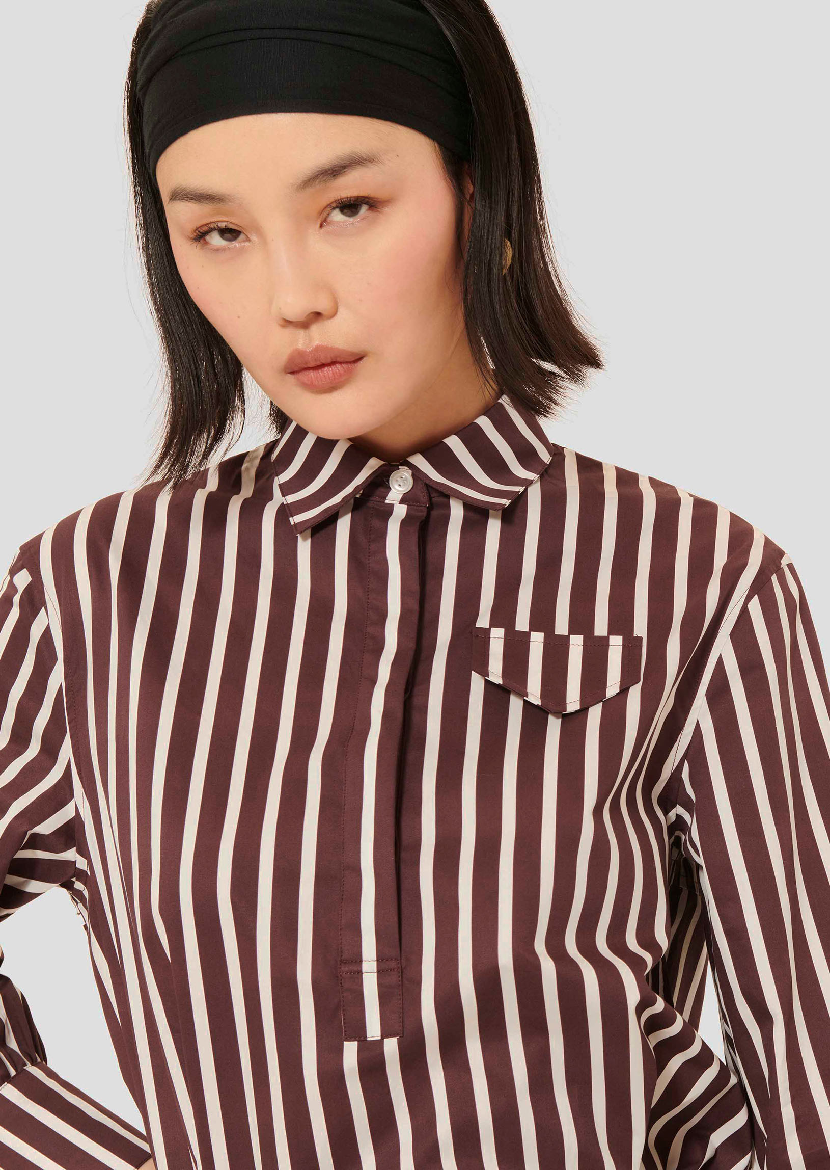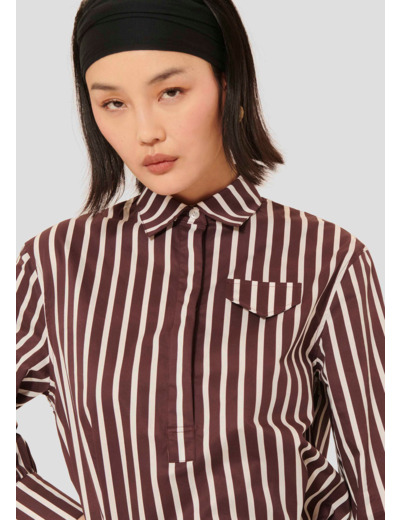 Cette chemise en popeline blanche à rayures couleur figue possède une coupe droite et légèrement oversized, un col chemise, des manches longues boutonnées et une fausse poche à la poitrine. Elle se ferme au-devant par des petits boutons dissimulés.