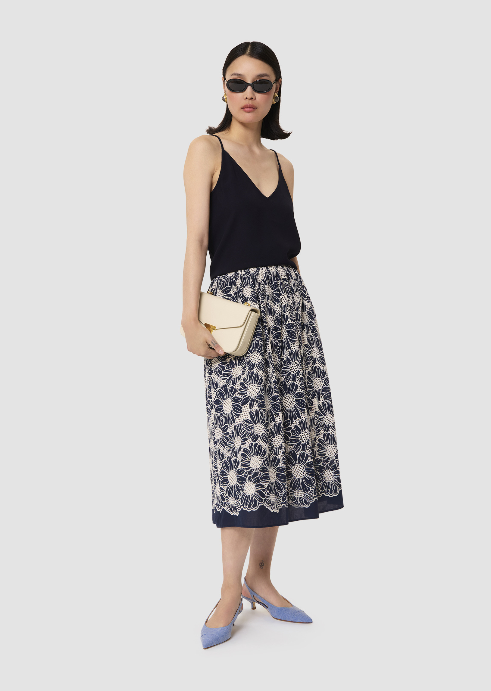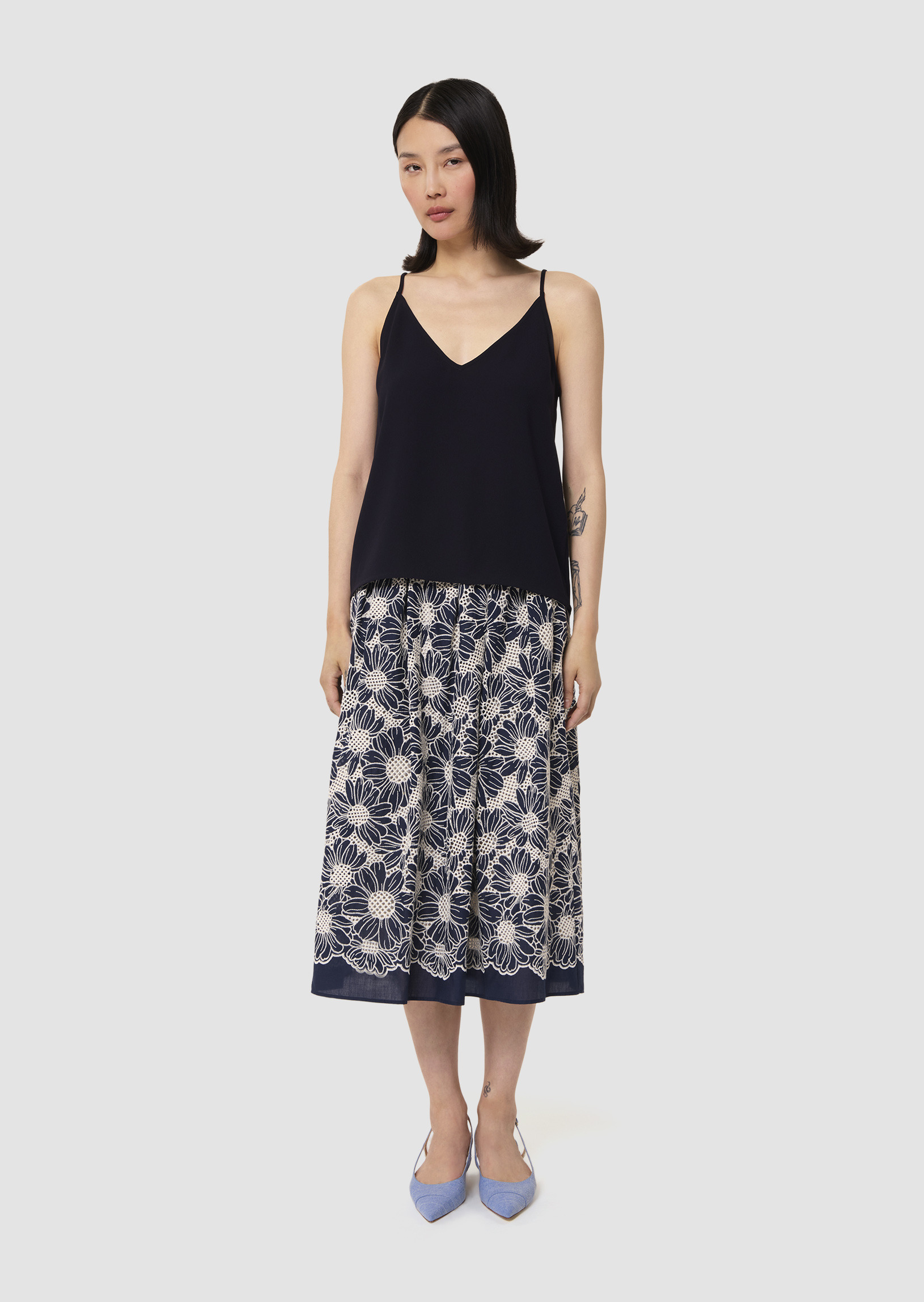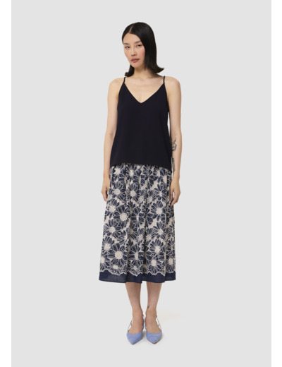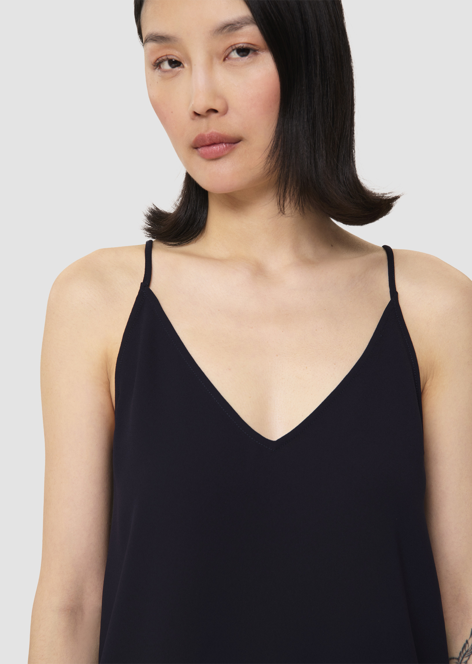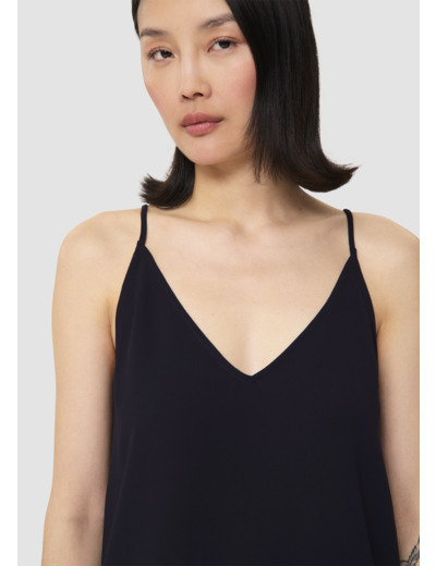 Ce top bleu nuit à bretelle en crêpe fluide possède un col en V et une coupe droite. Son encolure au dos est également en V.