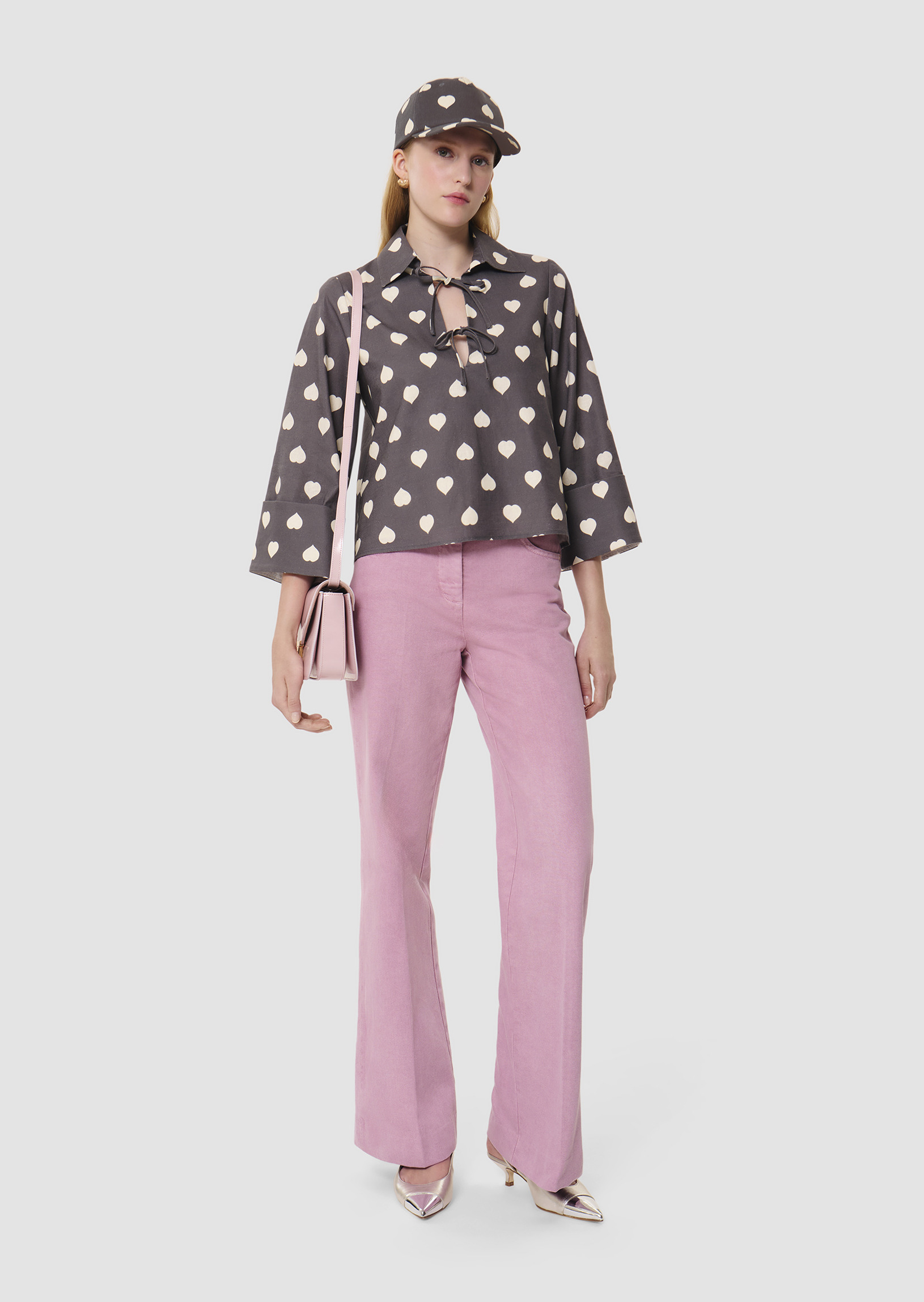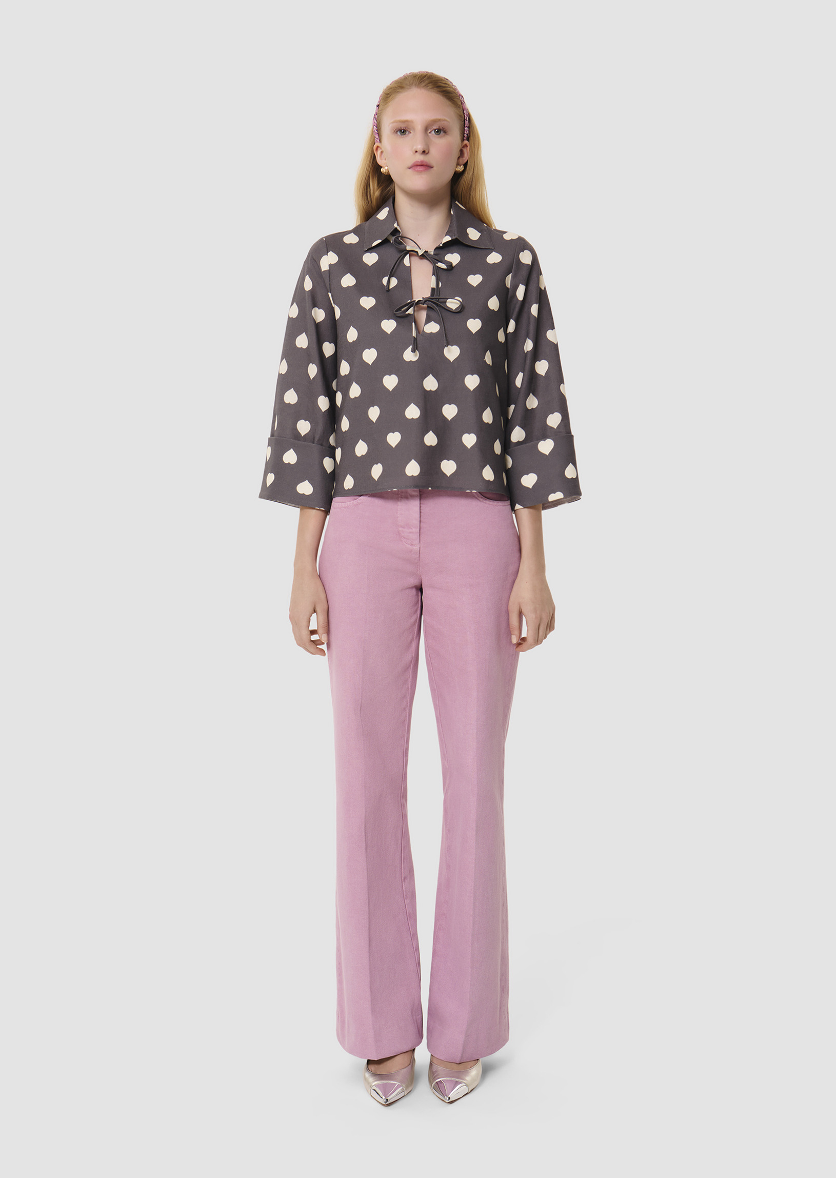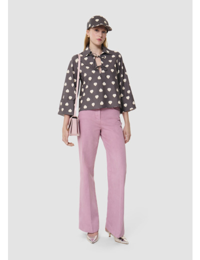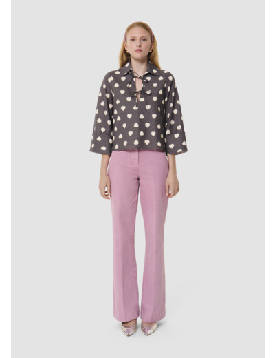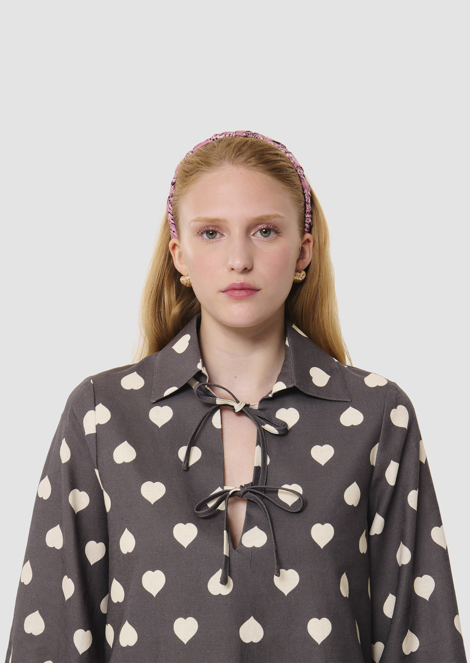 Ce top possède des manches 3/4 à larges revers, un col chemise décolleté noué par de fins liens ton sur ton. Il est entièrement imprimé d’un motif coeur blanc sur fond gris.