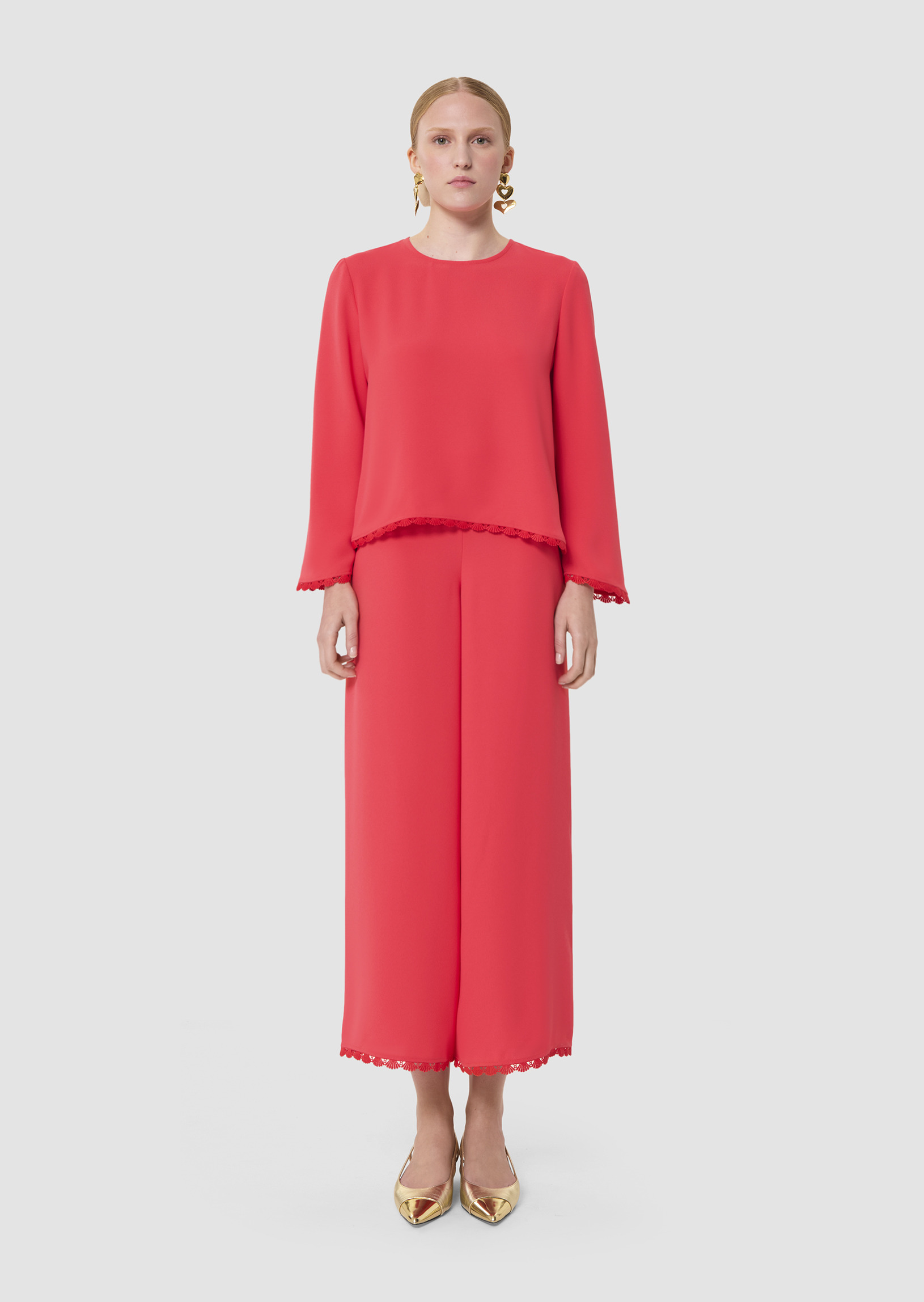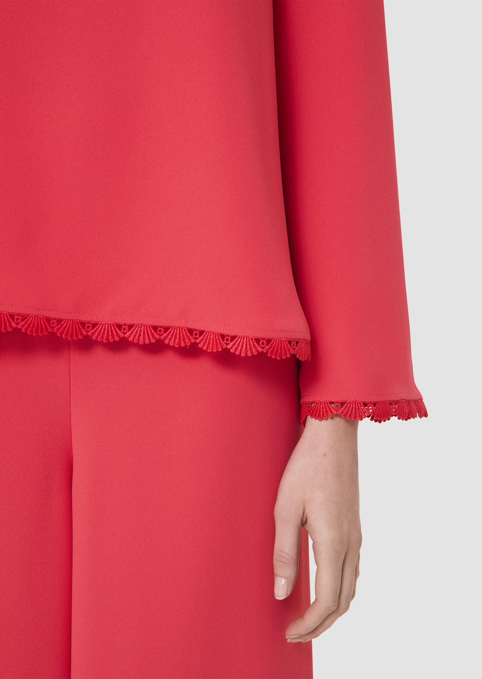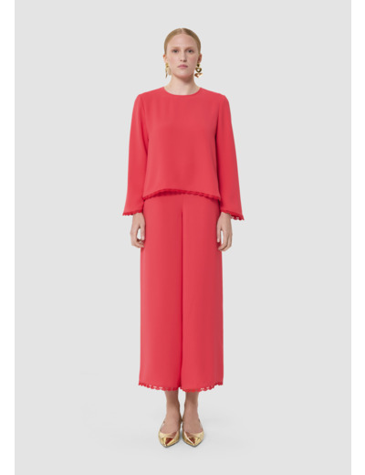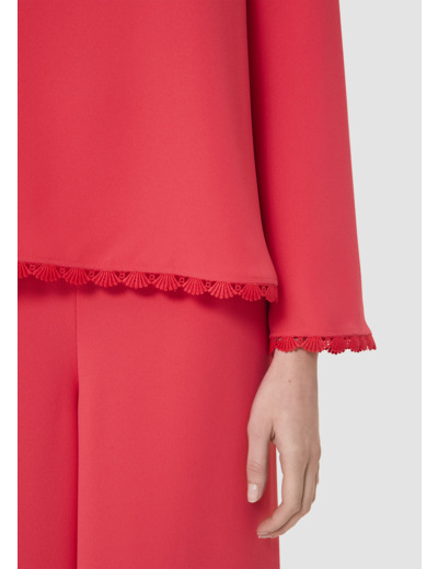 Ce top couleur rouge coquelicot en crêpe fluide possède un col rond et de longues manches évasées. Sa coupe trapèze est twistée par des finitions festonnées aux manches et au bas qui lui apportent un esprit romantique. Elle se ferme par un petit bouton ton sur ton au dos.