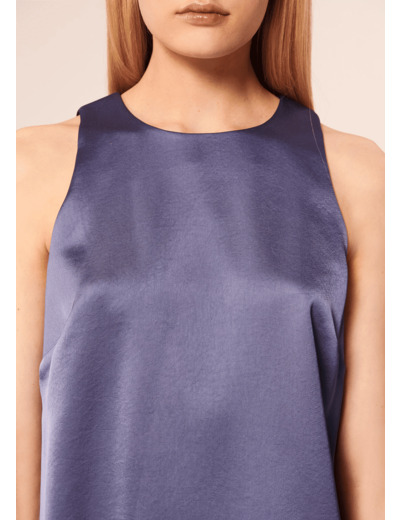 Ce débardeur bleu en satin possède une encolure ronde. Il est marqué sous la poitrine pour souligner la silhouette et donner une allure ultra féminine. Fermeture discrète par un crochet doré au dos.