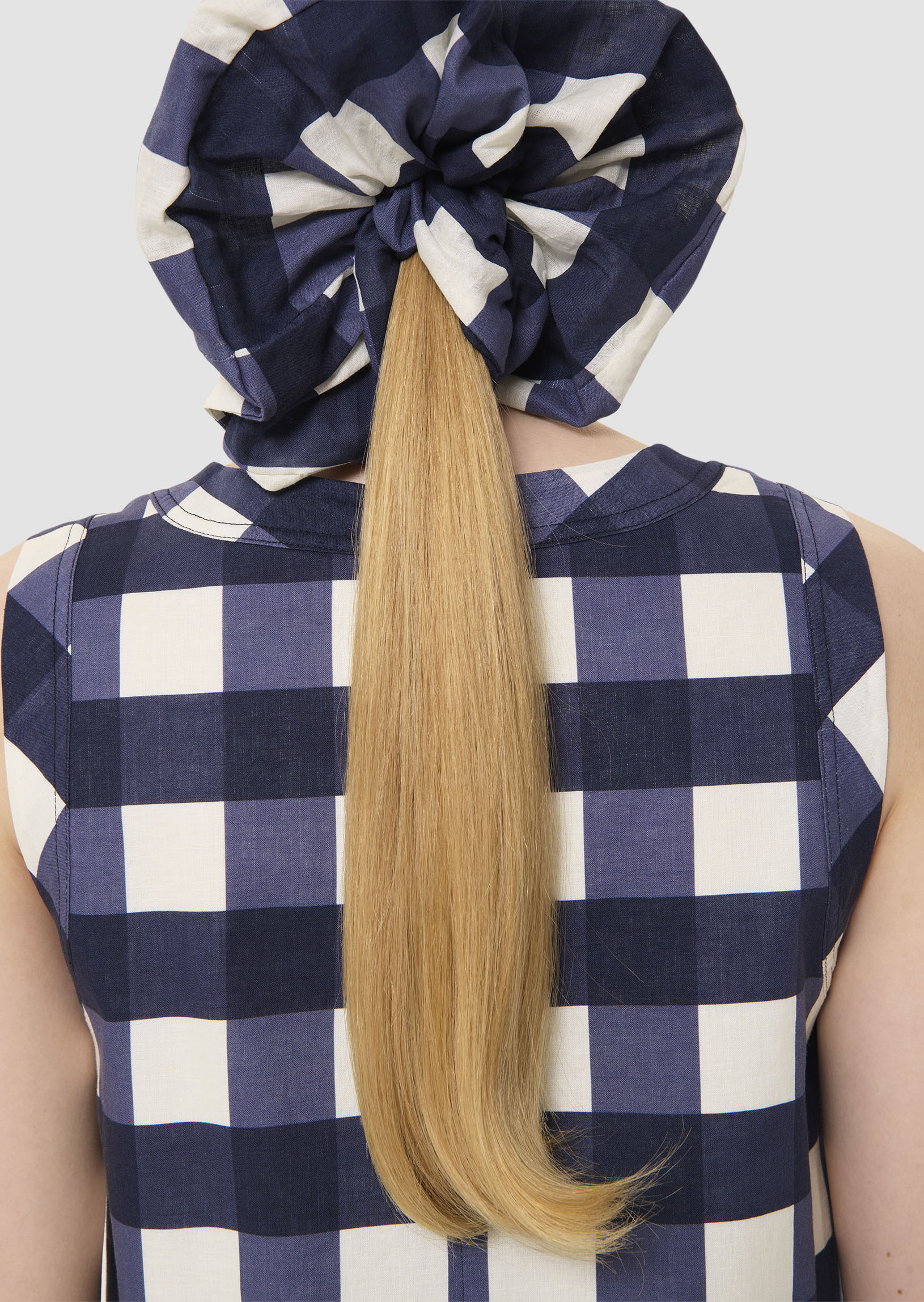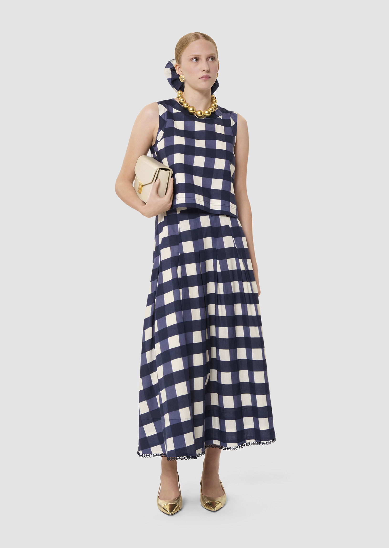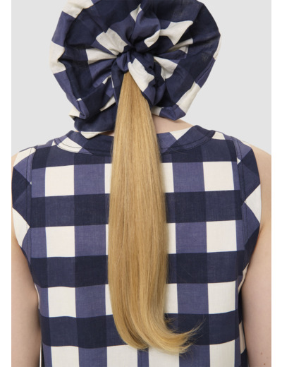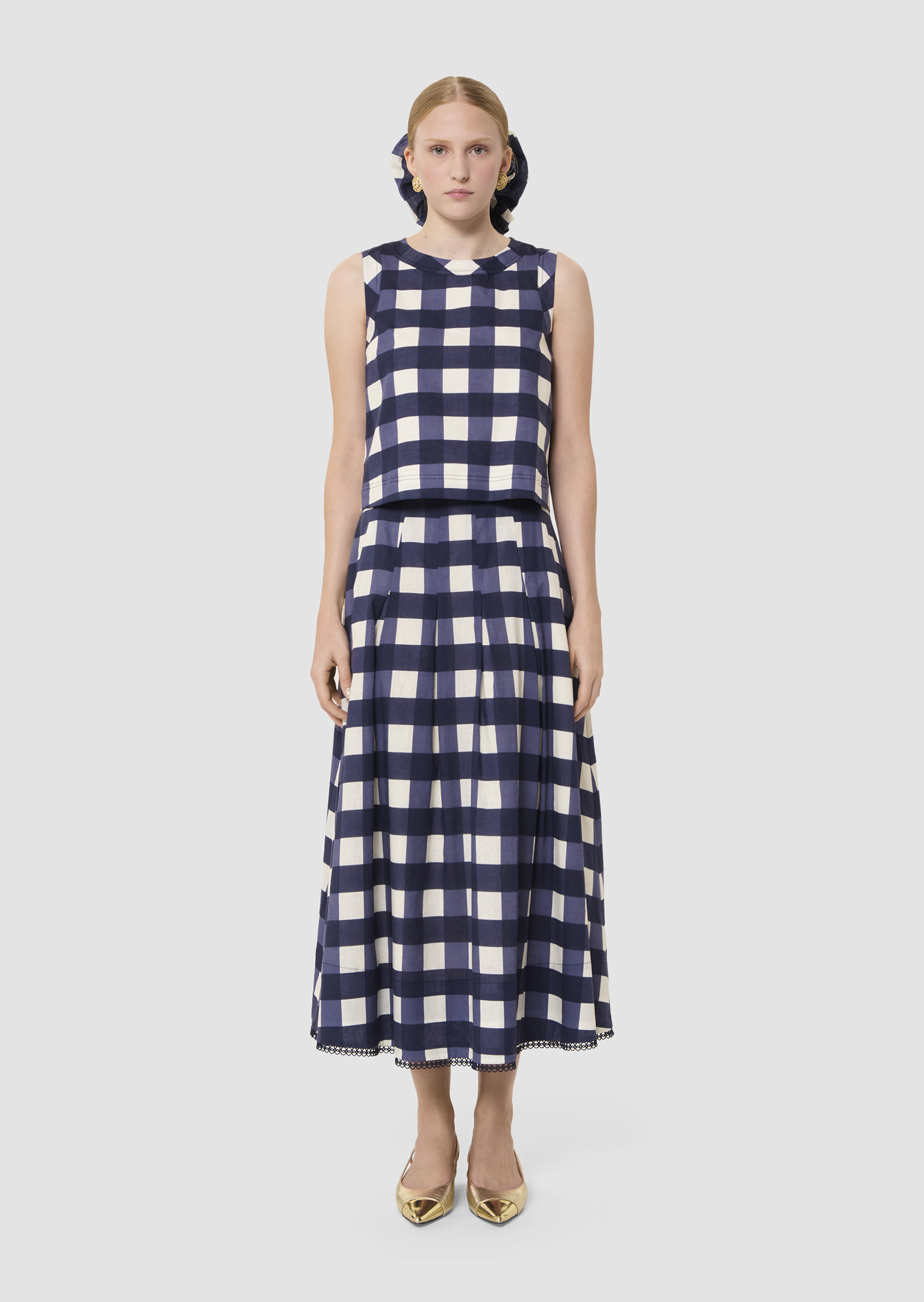 Ce top court bleu nuit sans manches en coton possède un col rond. Il est entièrement confectionné en gros vichy pour une allure romantique. Fermeture par un zip invisible au dos.