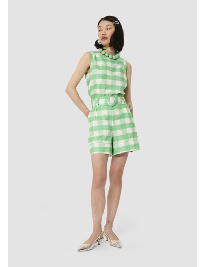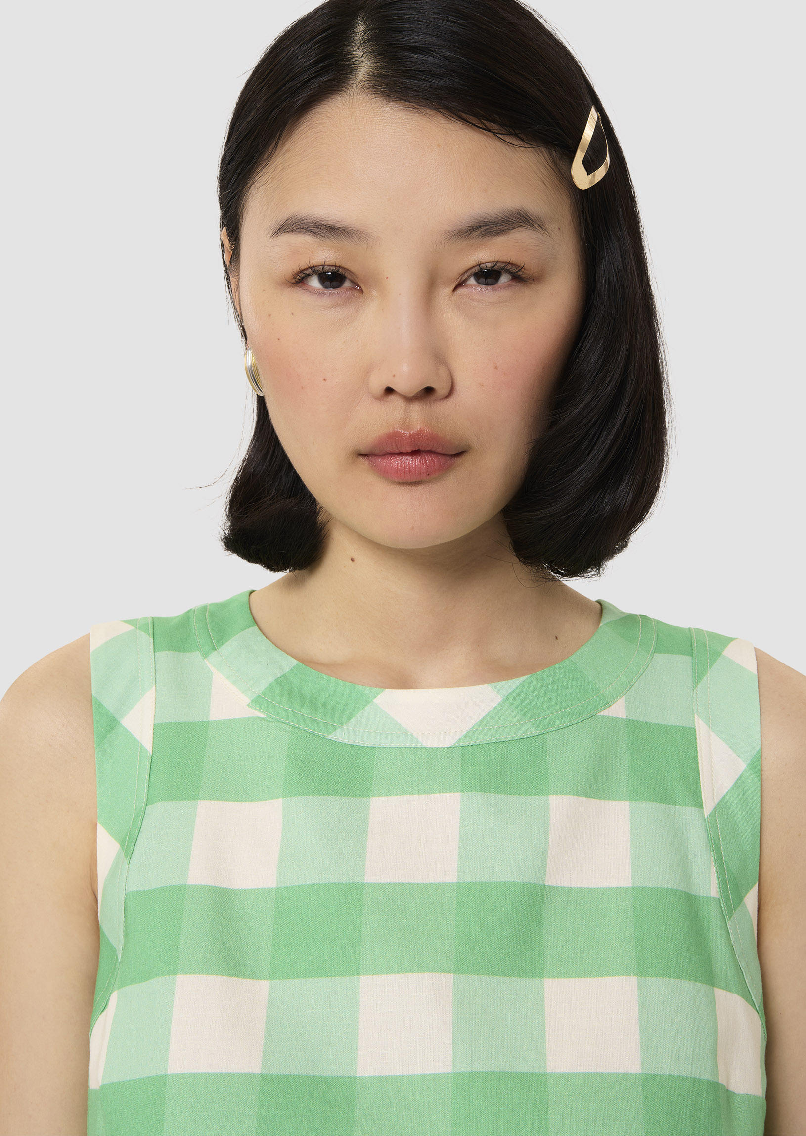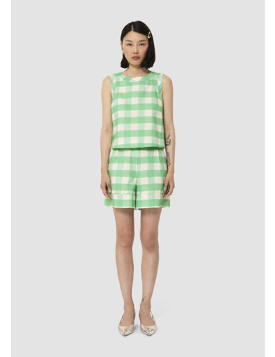 Ce top court vert sans manches en coton possède un col rond. Il est entièrement confectionné en gros vichy pour une allure romantique. Fermeture par un zip invisible au dos.