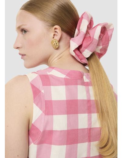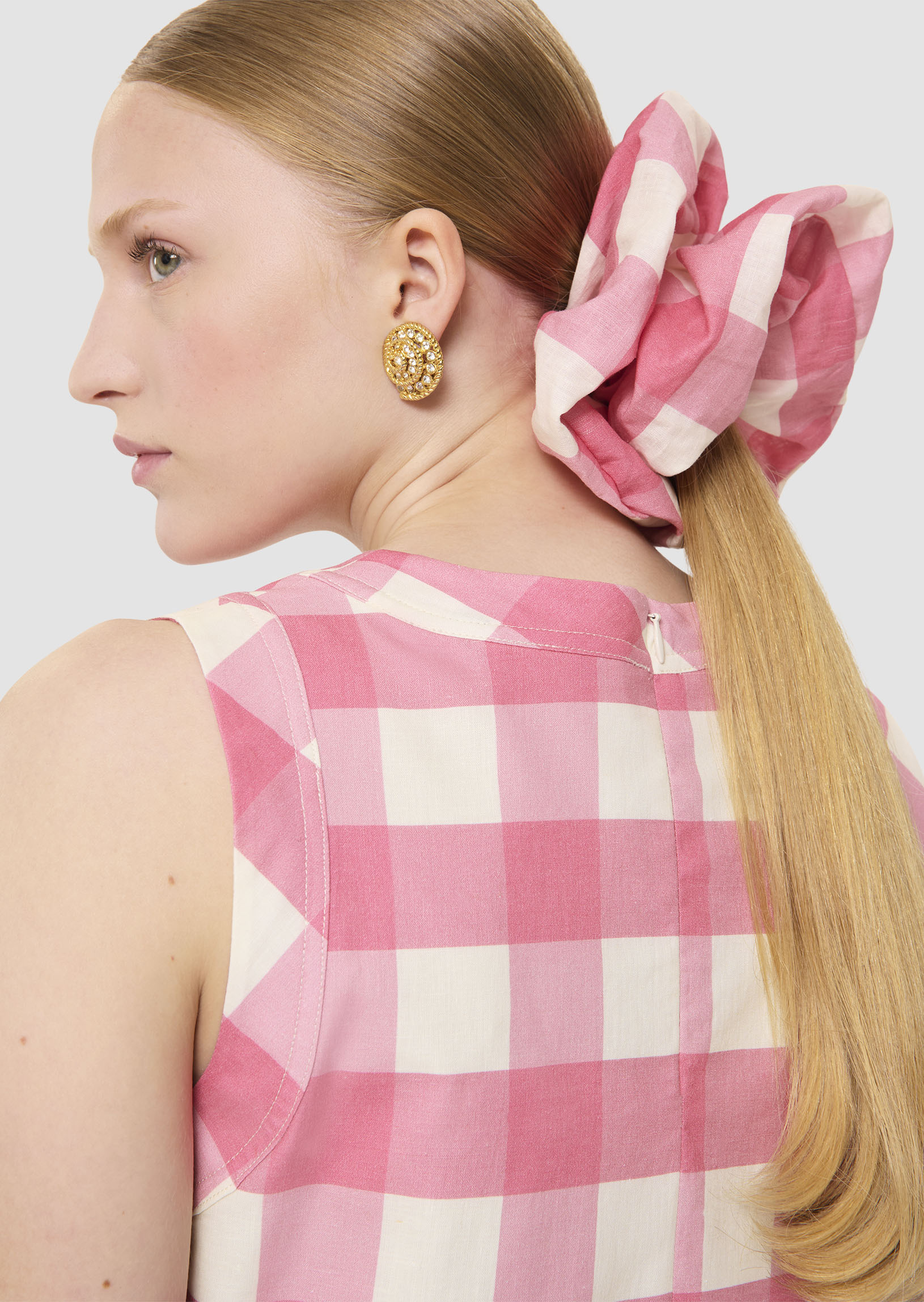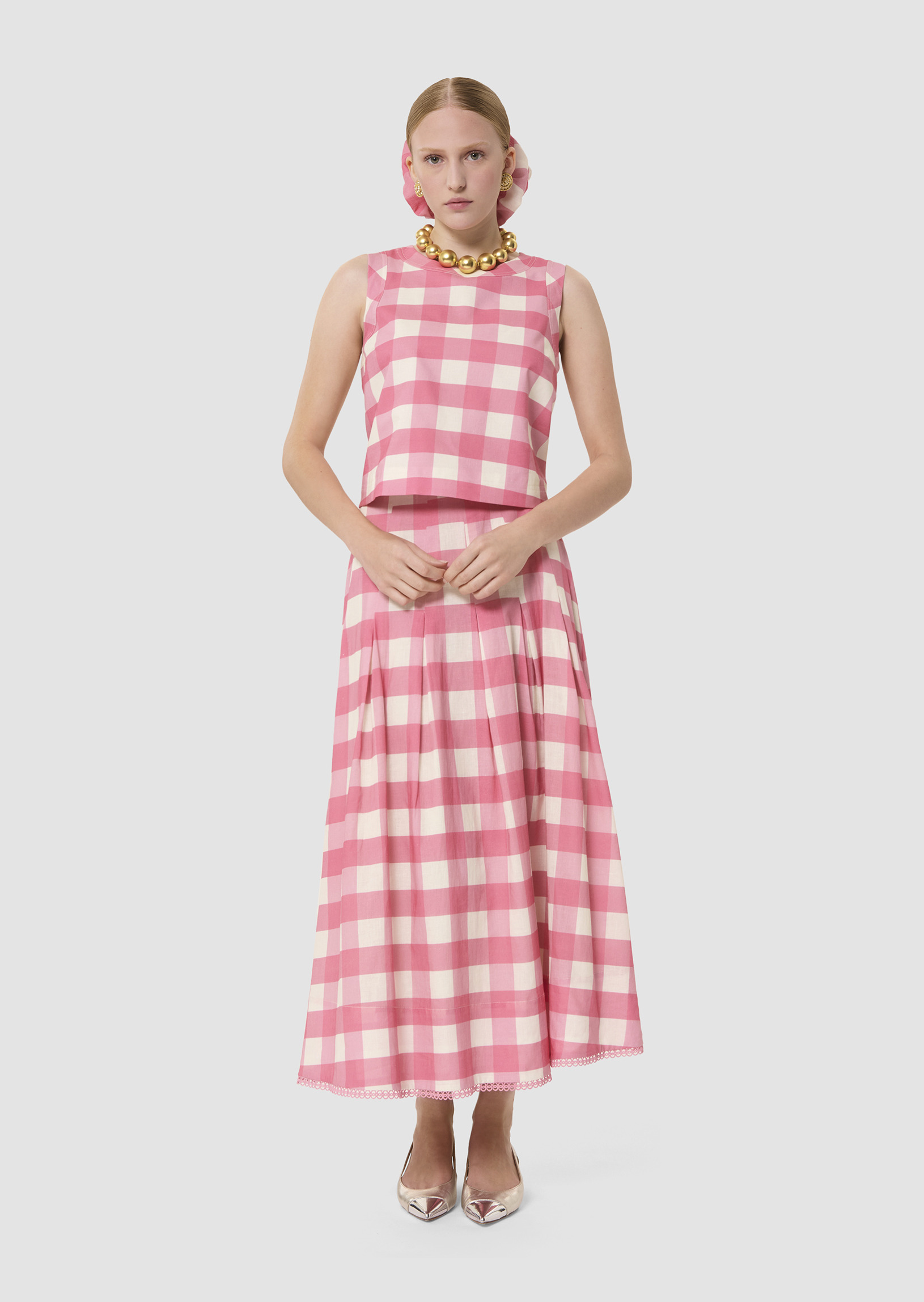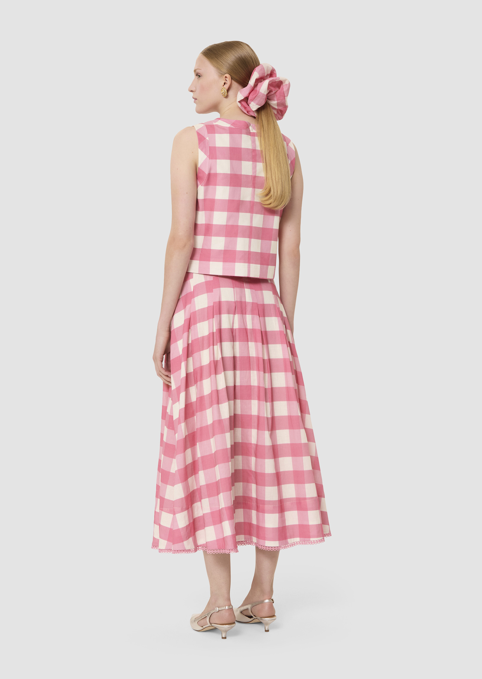 Ce top court rose sans manches en coton possède un col rond. Il est entièrement confectionné en gros vichy pour une allure romantique. Fermeture par un zip invisible au dos.