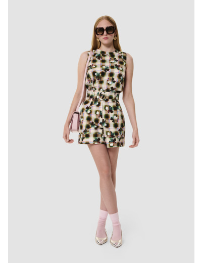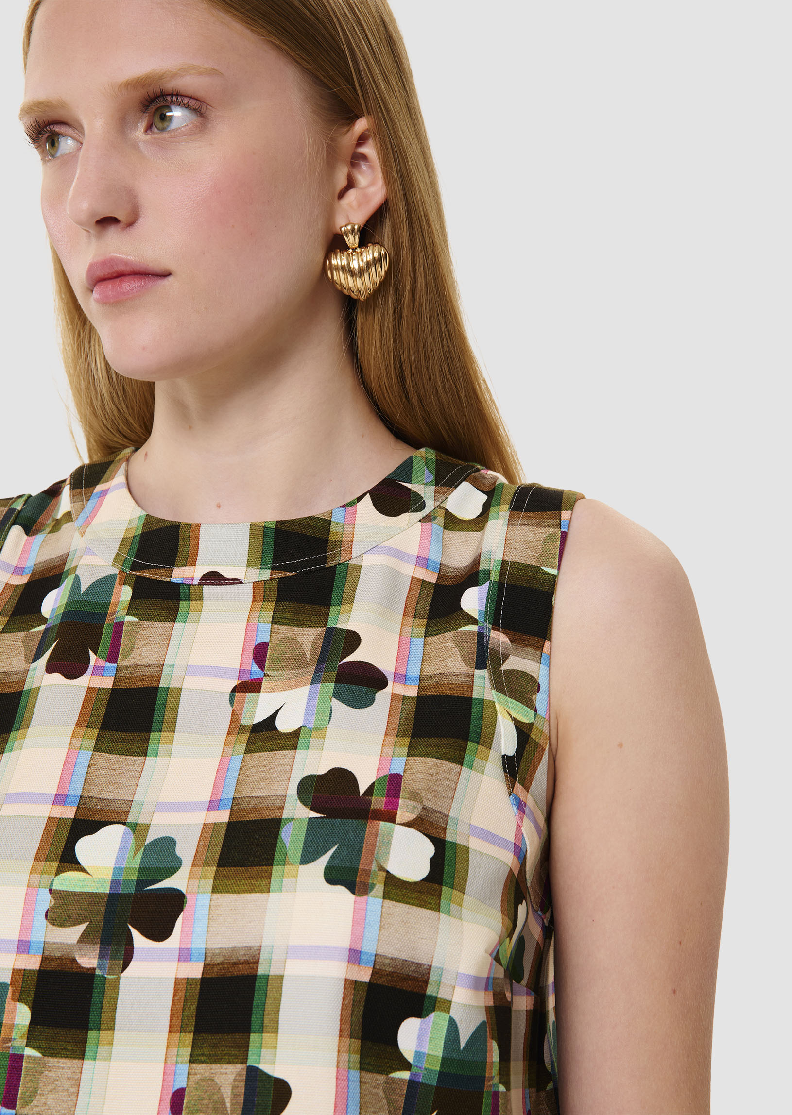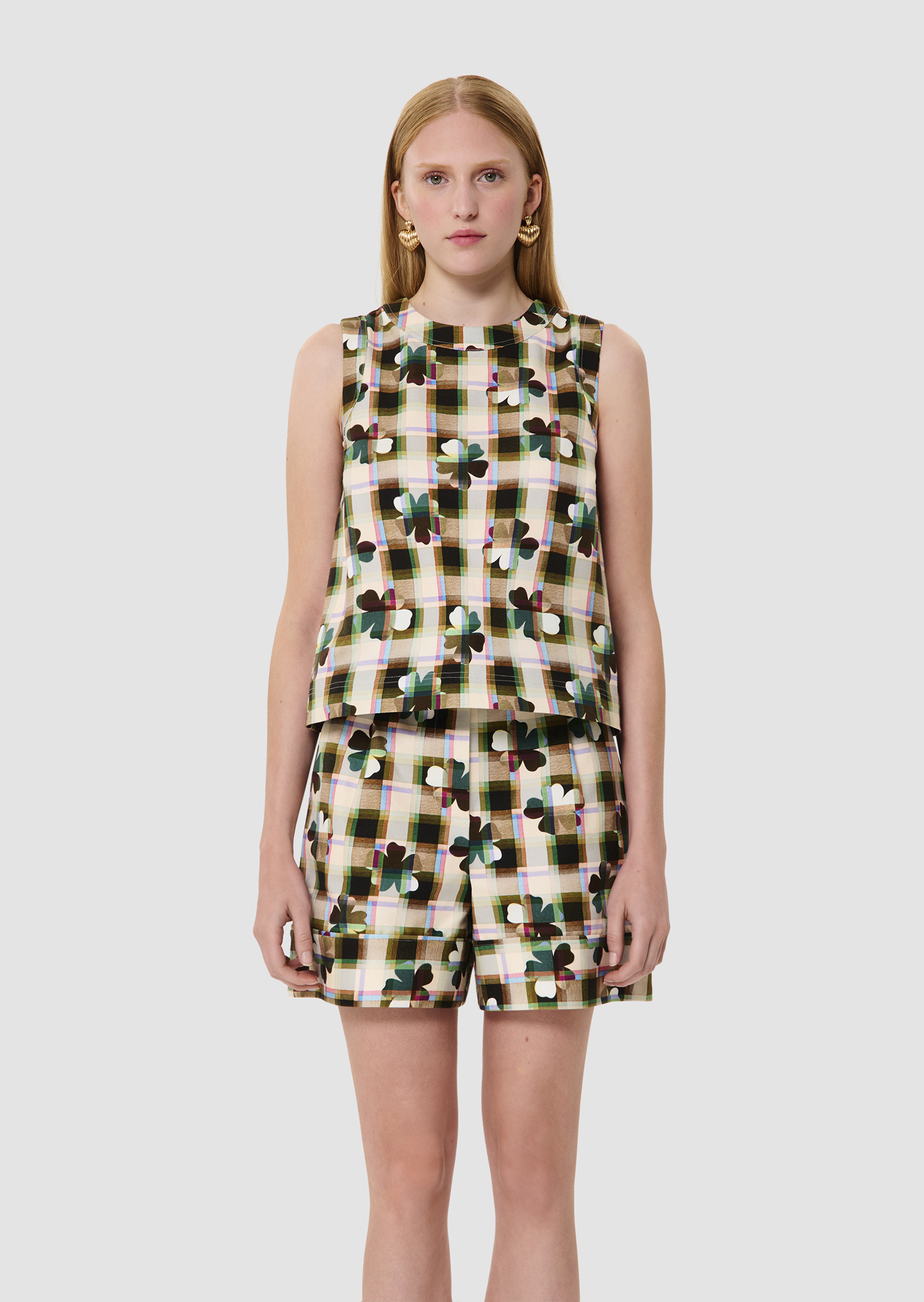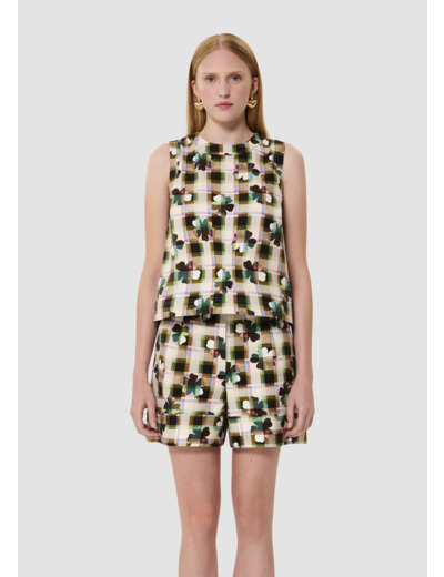 Ce top court couleur vert thym sans manches en coton possède un col rond. Il est entièrement imprimé de notre motif trèfles et il est sûrpiqué pour une allure plus casual. Fermeture par un zip invisible au dos.