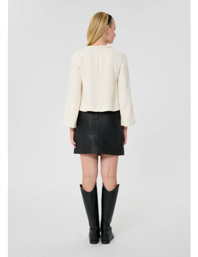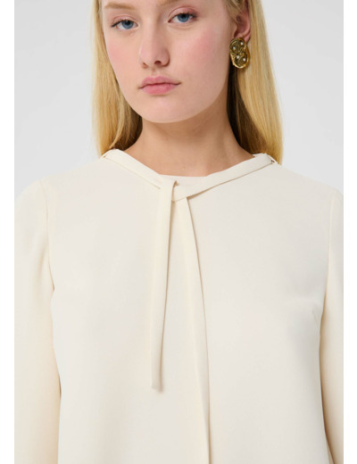 Ce top écru en crêpe possède une coupe droite, une encolure ronde et des manches longues et larges, le monograme de la maison décore la manche gauche. Son twist réside dans le fin lien ton sur ton décorant l'encolure et pouvant se nouer. Il se ferme par un zip invisible au dos.