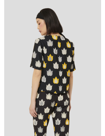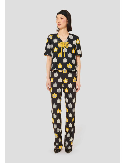 Ce top reprend notre imprimé flammes sur fond noir. Sa coupe est droite et il possède des manches courtes ainsi qu'une encolure en V. Un fin lien écru est noué au-devant, apportant une touche de luminosité. On le porte avec le pantalon Paivan assorti pour un total look original.