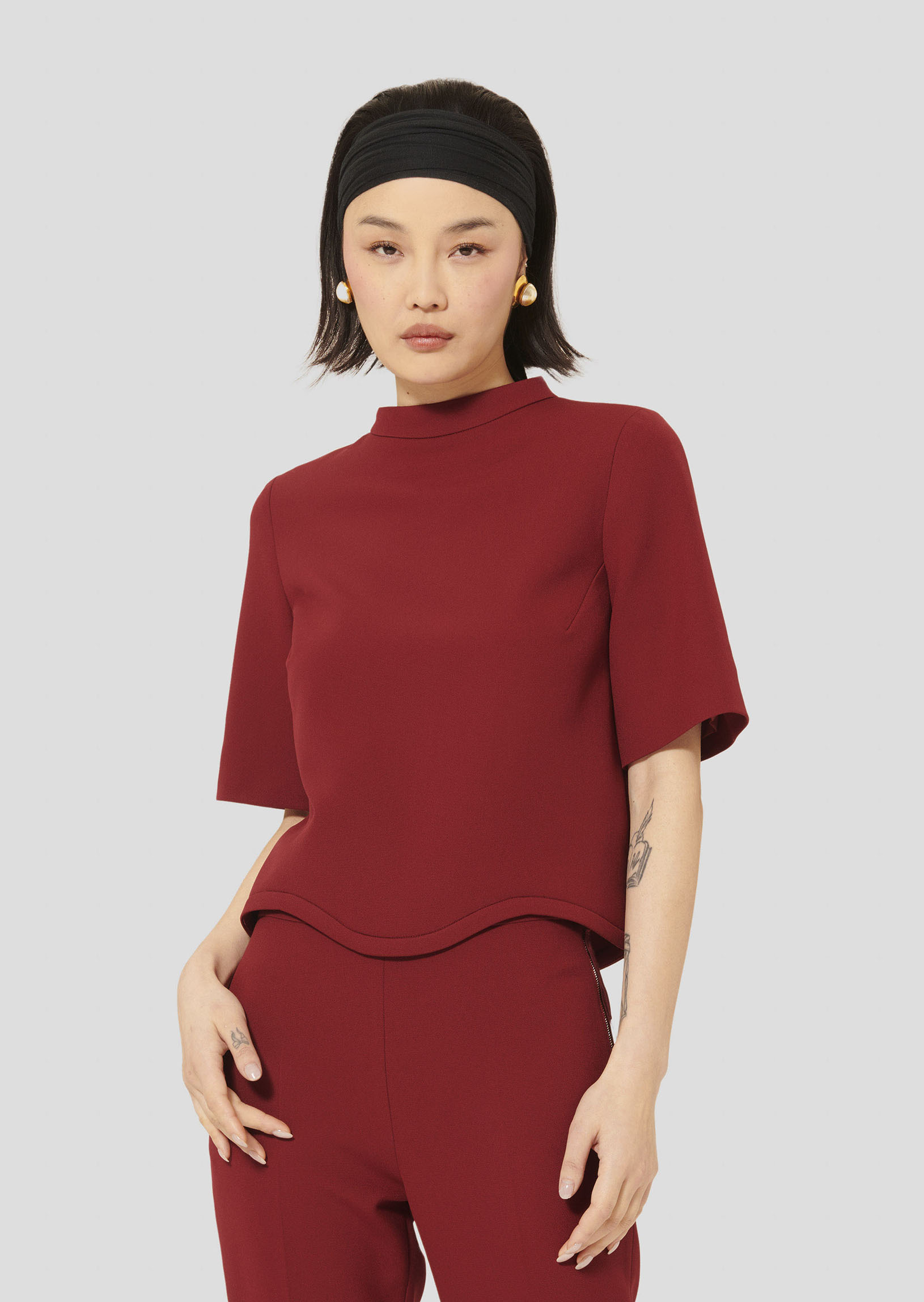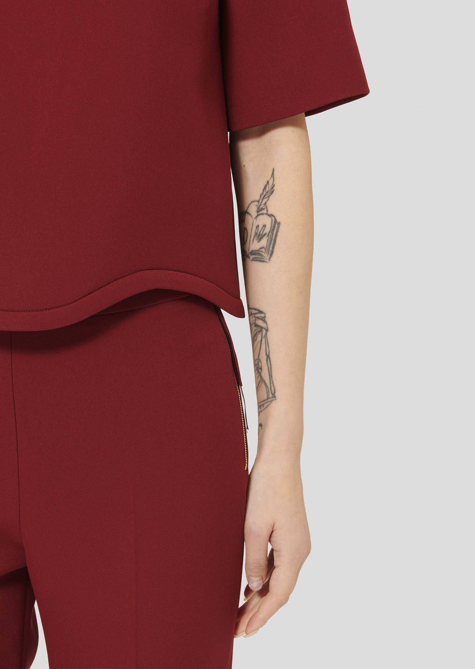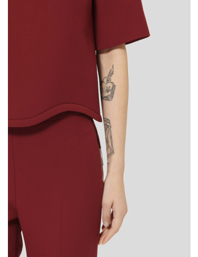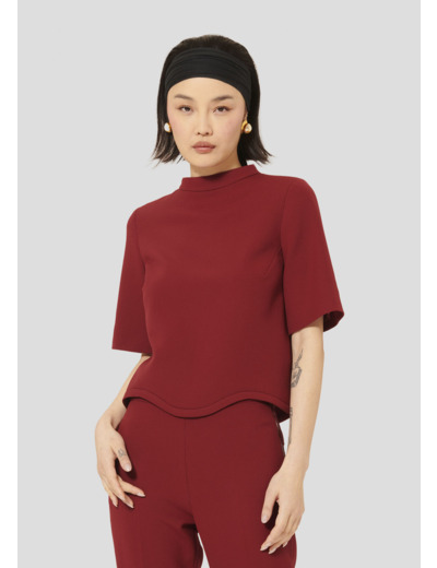 Ce haut couleur bordeaux en toile double possède une encolure ronde et des manches courtes. Sa finition festonnée lui donne un esprit résolument preppy. Il se ferme par un zip invisible au dos.