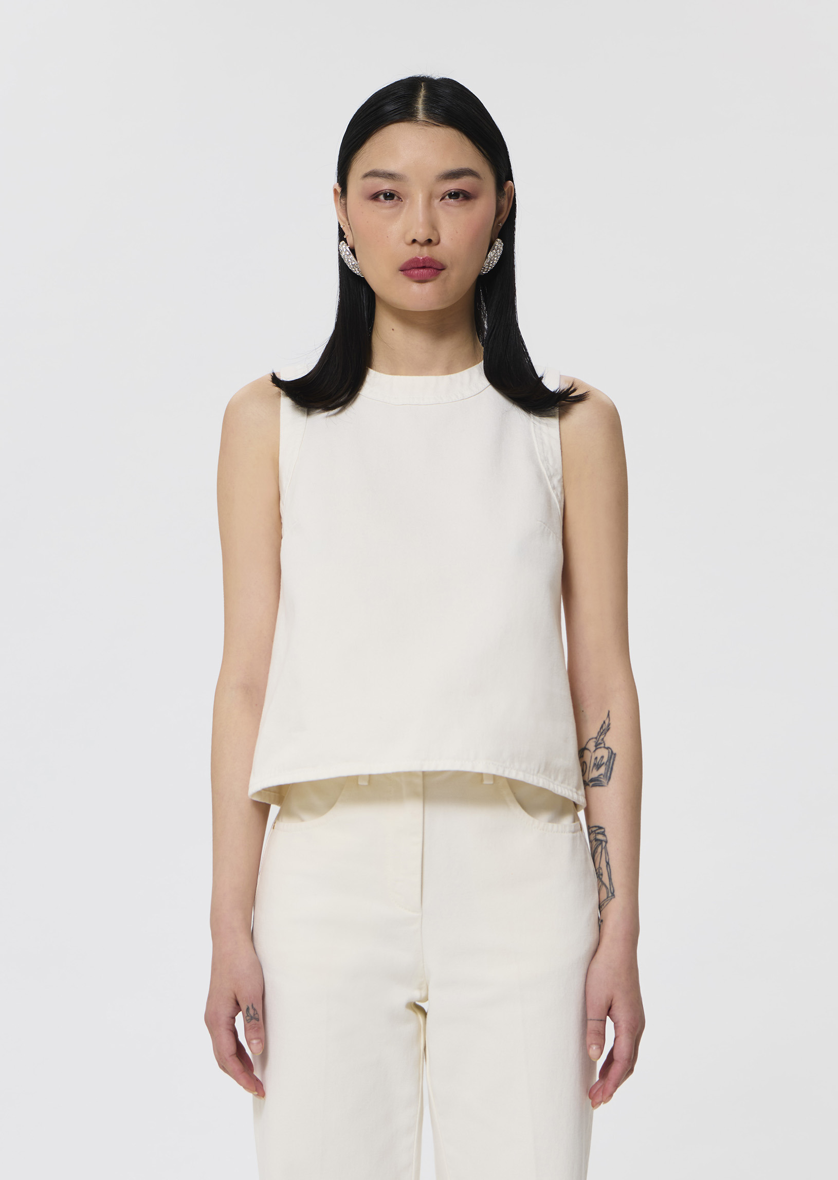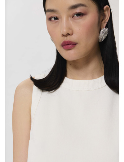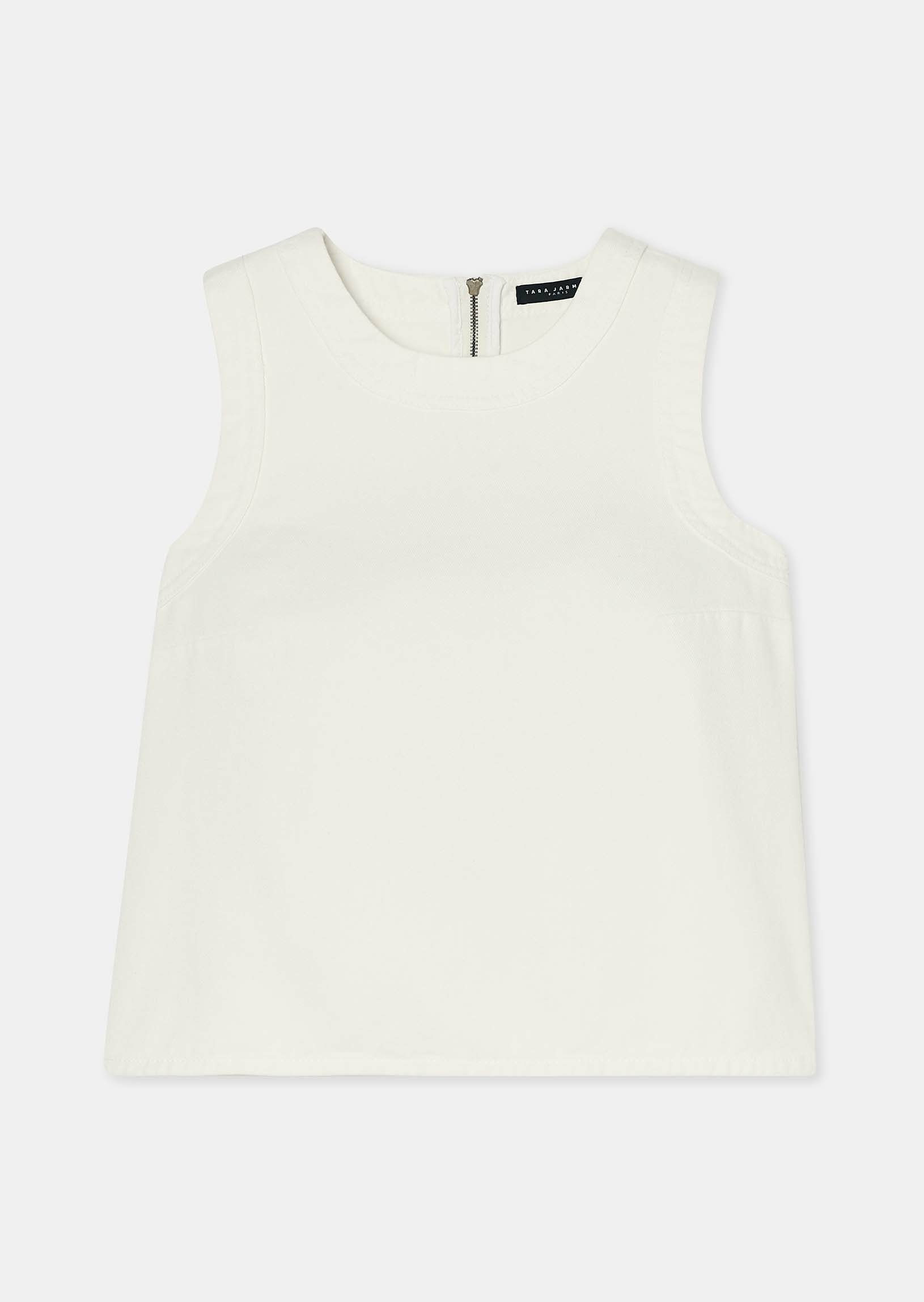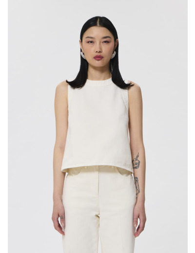 Ce haut en denim blanc sans manches possède une coupe courte légèrement évasée et une encolure ronde. Il se ferme au niveau de la nuque par un zip métallique. On le porte avec le jean Jerome assorti pour un total look denim estival.