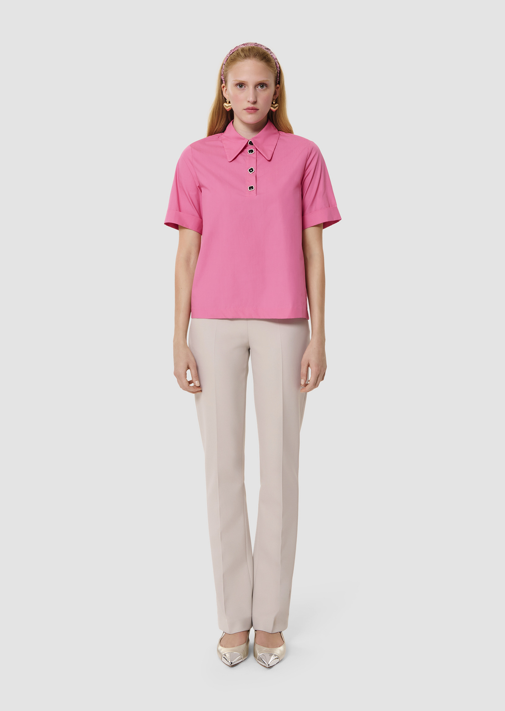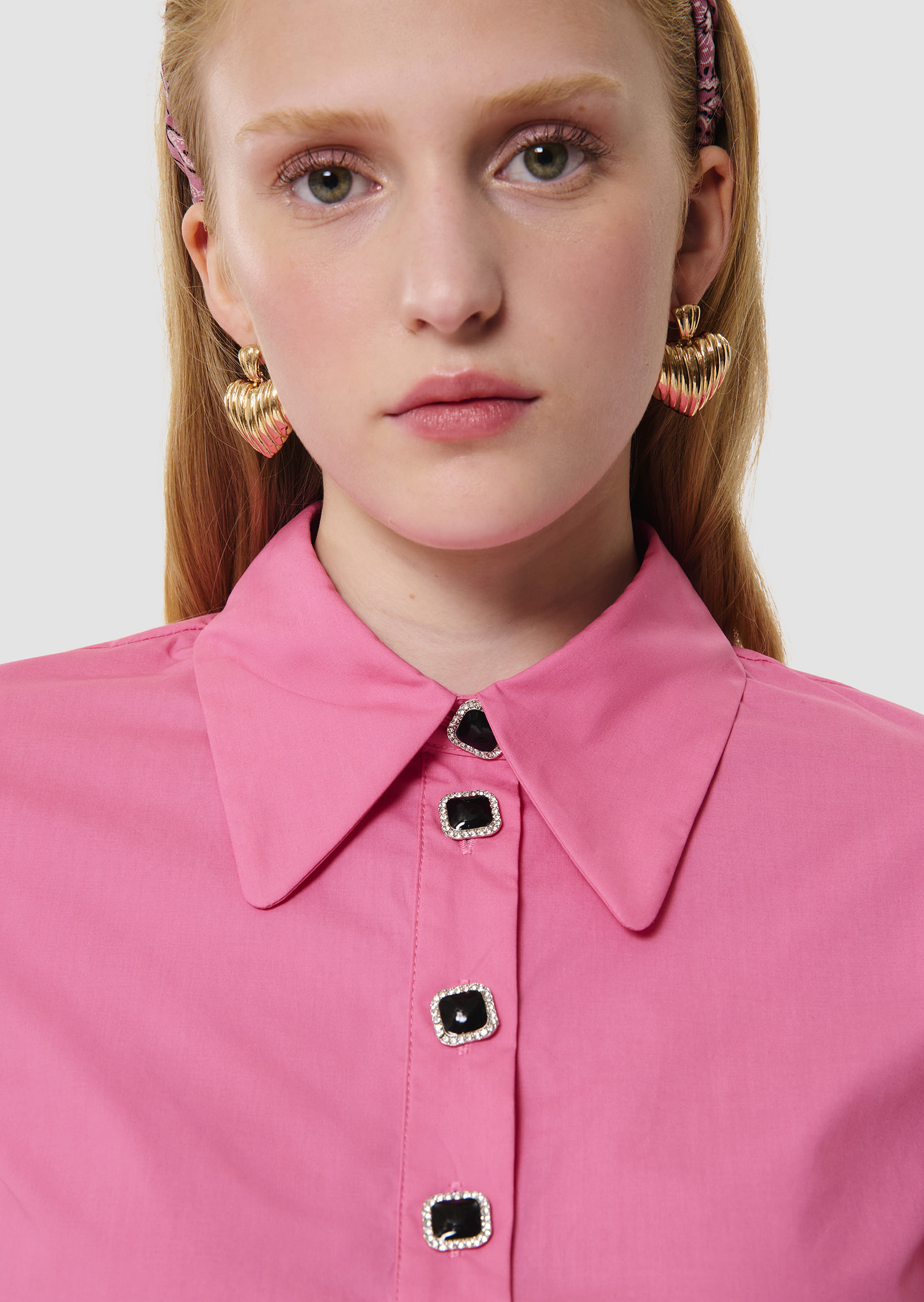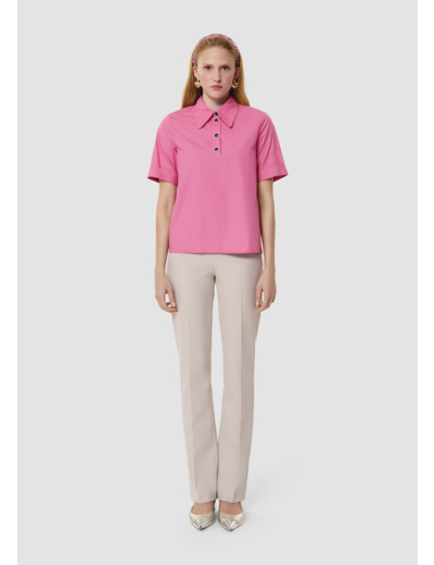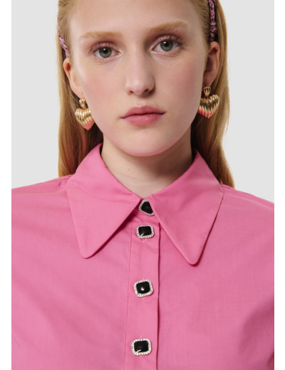 Ce chemisier rose en popeline possède un col chemise et des manches courtes à revers. Il est boutonné au col par de jolis boutons bijoux noirs à strass.