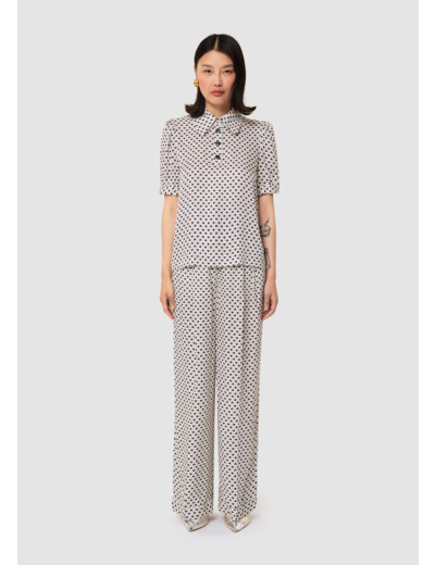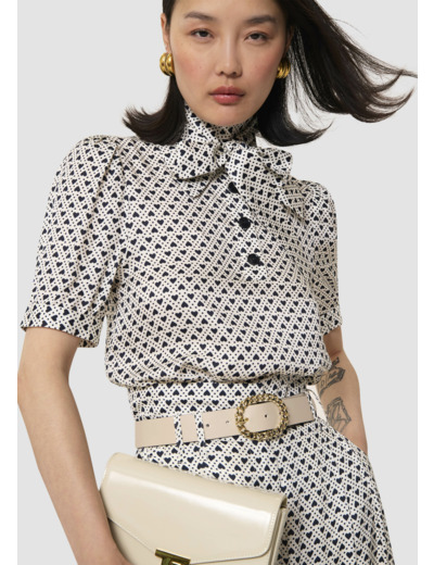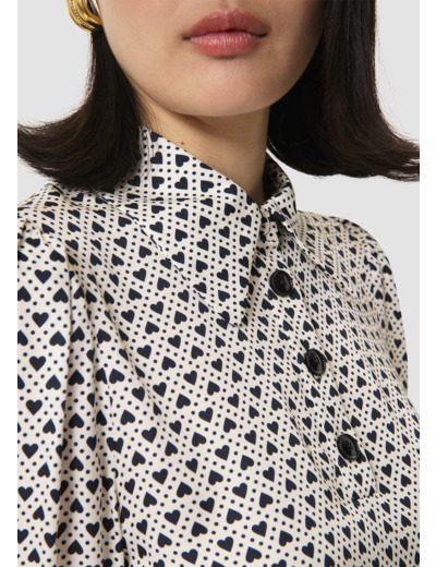 Ce chemisier écru imprimé de notre motif mini coeurs bleu nuit possède une coupe droite fluide, des manches courtes froncées aux épaules et un col chemise. Il est boutonné au col par des boutons bleu nuit, que l'on retrouve également aux extrémités des manches.