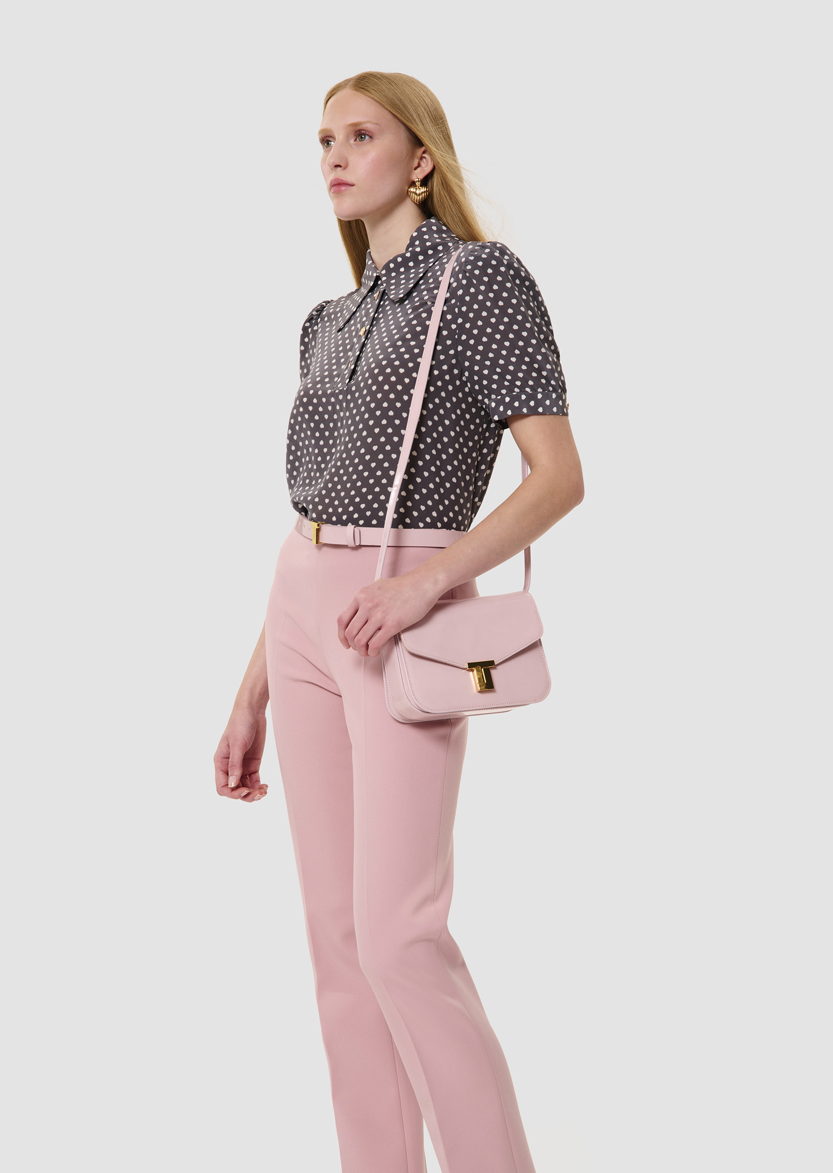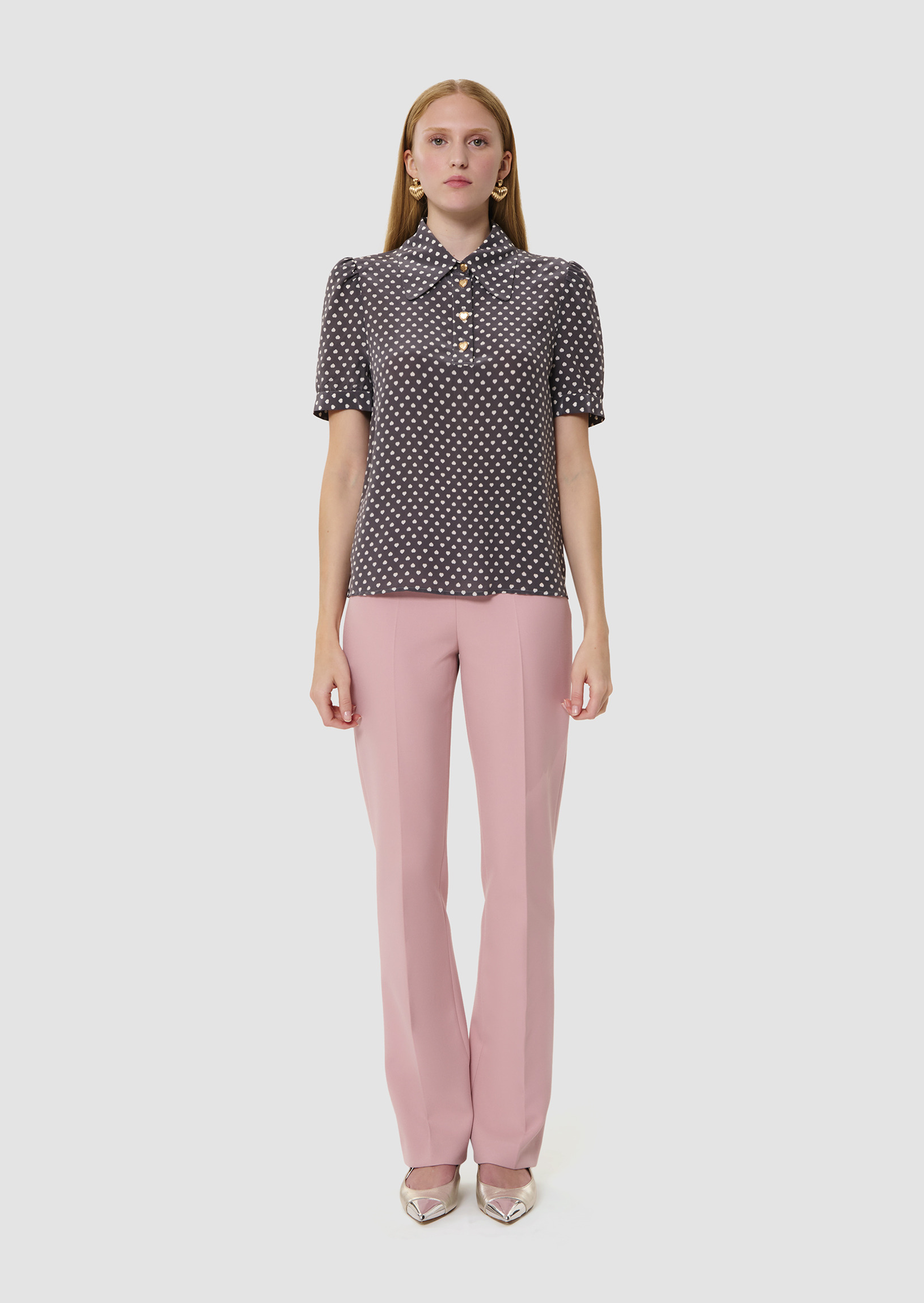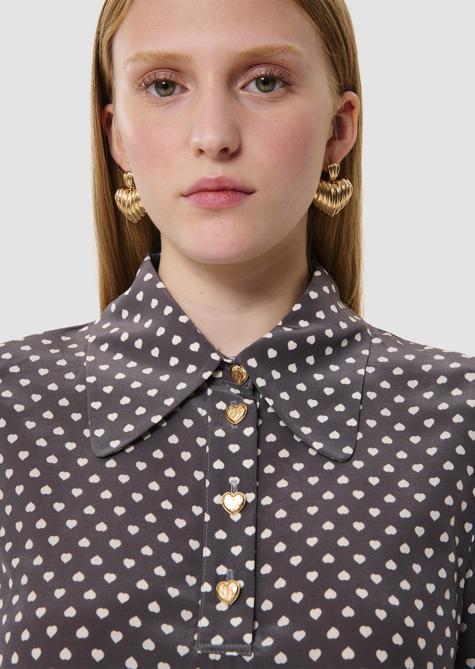 Ce chemisier gris imprimé de notre motif mini coeurs blancs possède, une coupe droite fluide, des manches courtes froncées aux épaules et un col chemise. Il est boutonné au col par de jolis boutons bijoux en forme de coeur, que l'on retrouve également aux extrémités des manches.