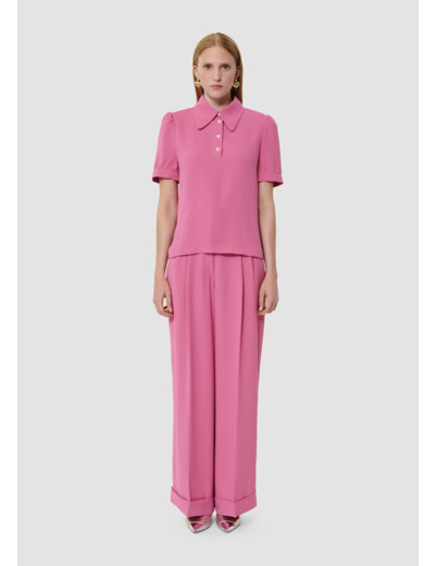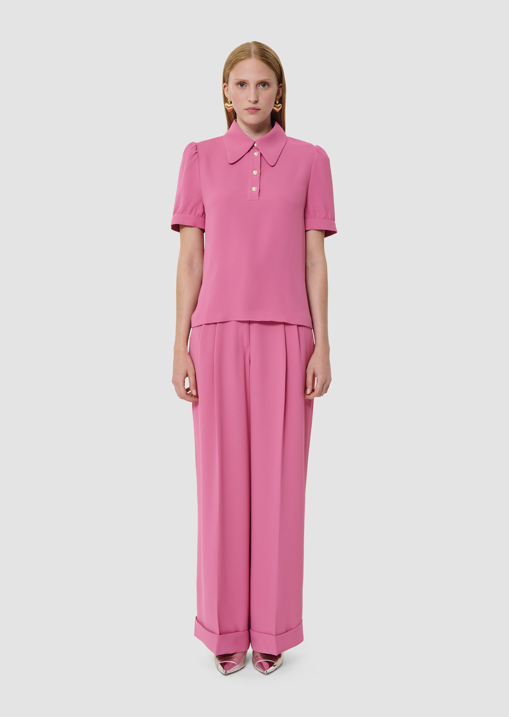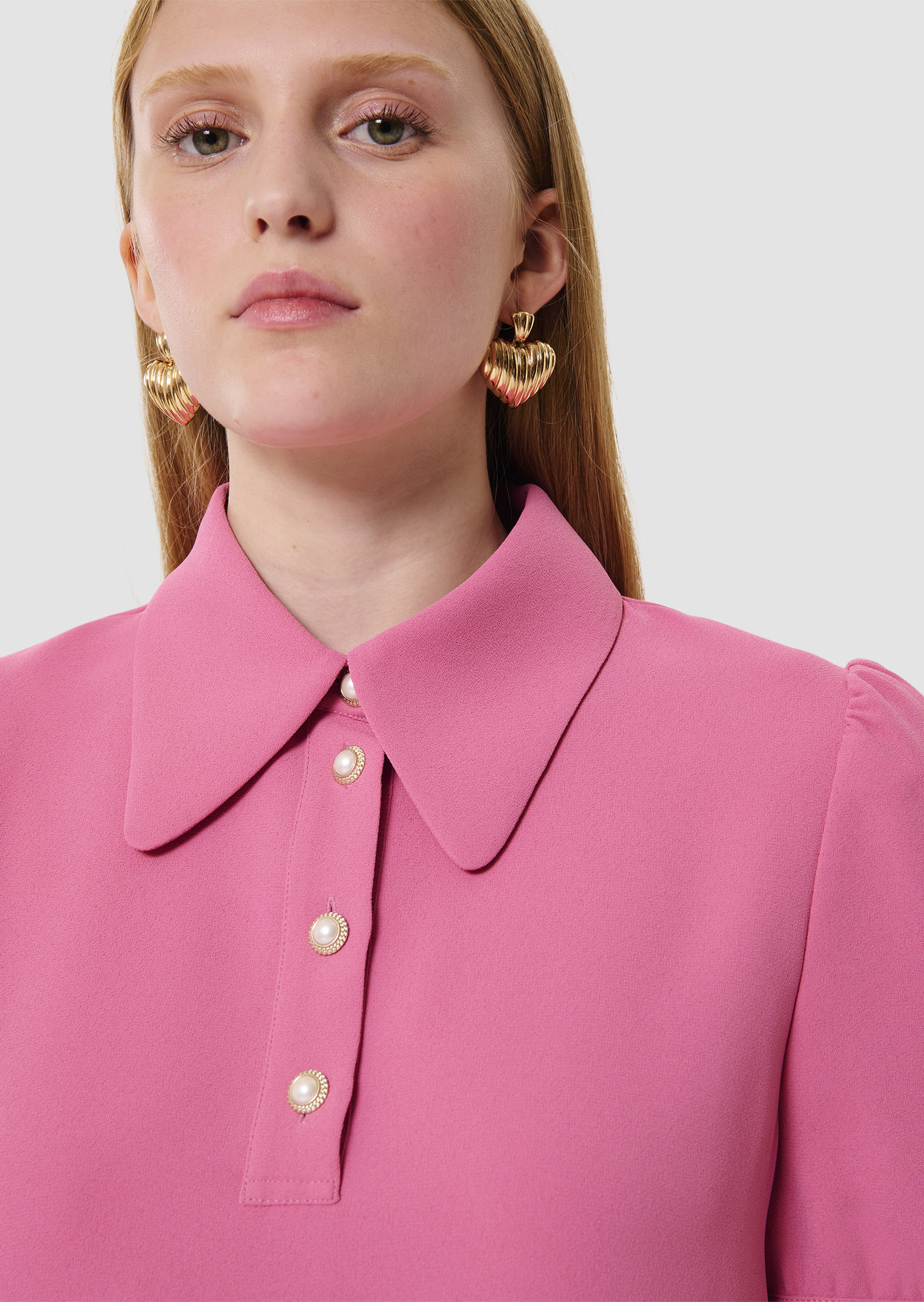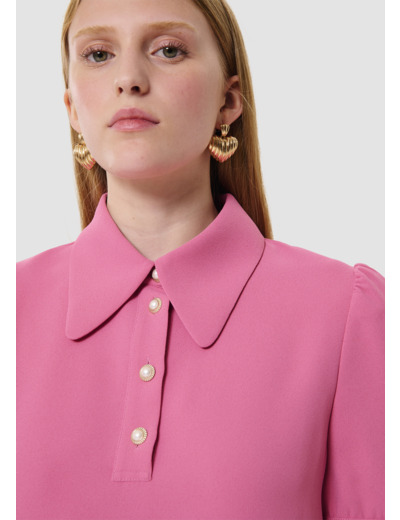 Ce chemisier rose en crêpe possède une coupe droite fluide, des manches courtes froncées aux épaules et un col chemise. Il est boutonné au col par de jolis boutons bijoux, que l'on retrouve également aux extrémités des manches.