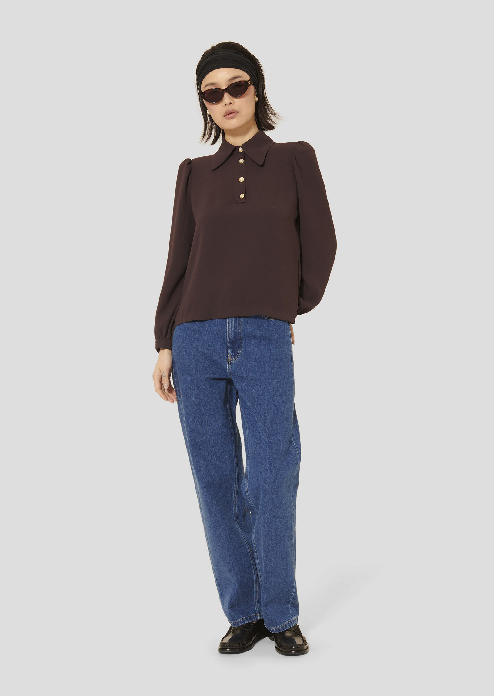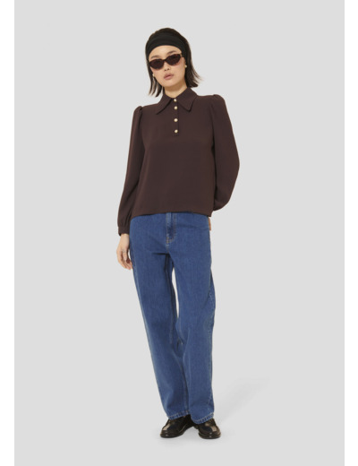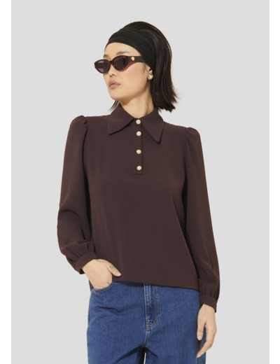 Ce top couleur chocolat en crêpe fluide possède des manches longues ballons et un col chemise. Il est boutonné au col par de jolis boutons bijoux que l'on retrouve également aux poignets.