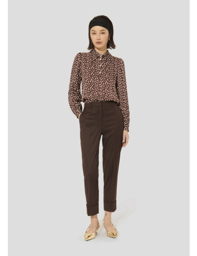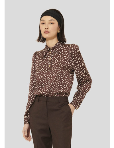 Ce top couleur chocolat imprimé à pois possède une coupe fluide, des manches longues ballons et un col chemise. Il est boutonné au col par de jolis boutons bijoux dorés que l'on retrouve également aux poignets.