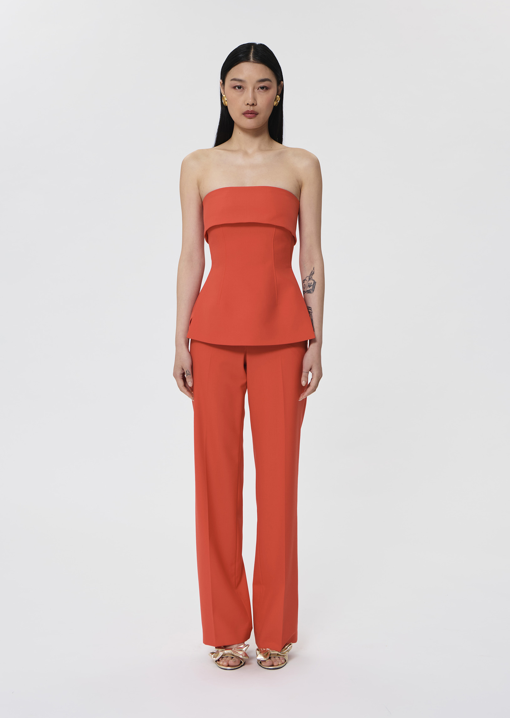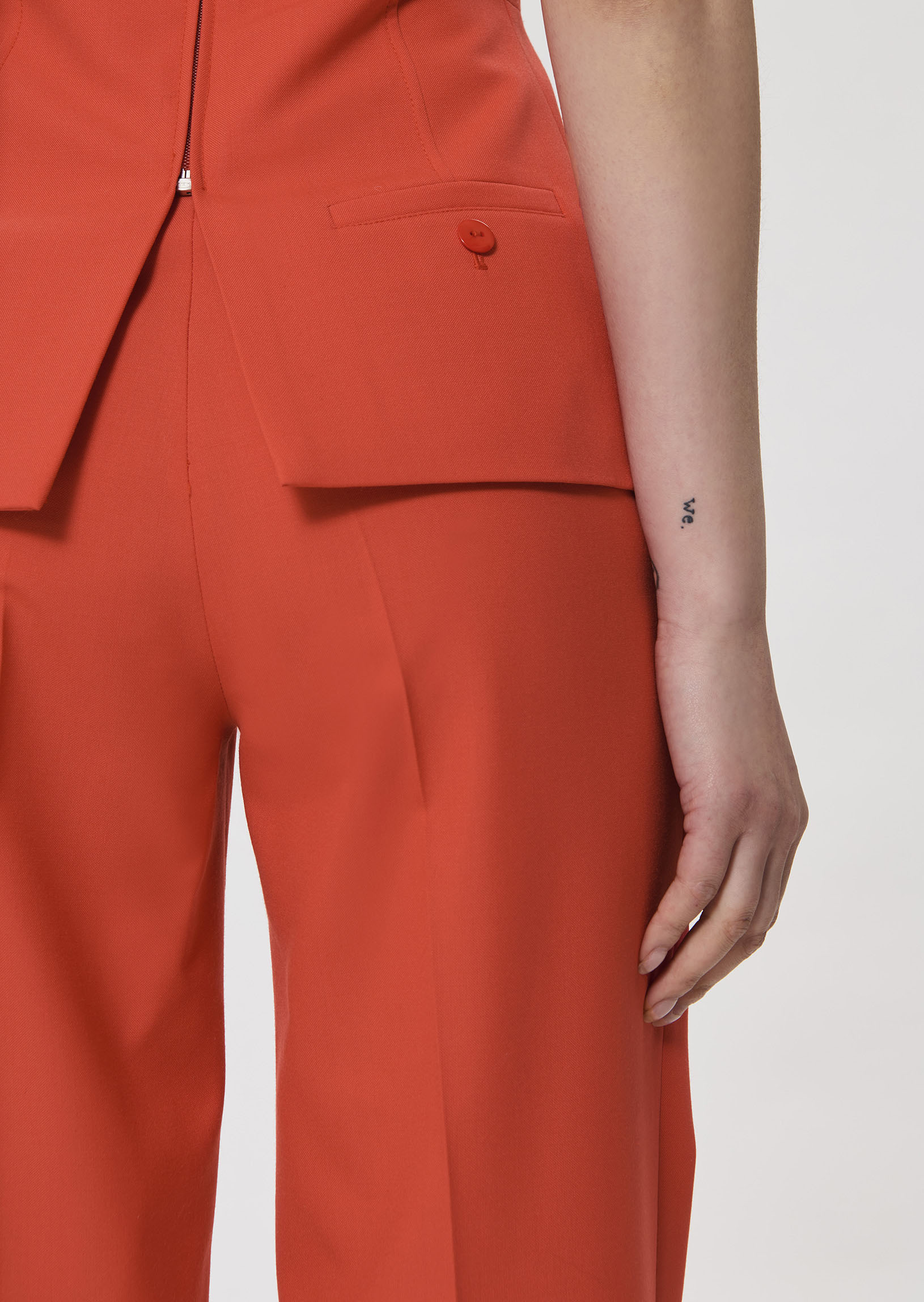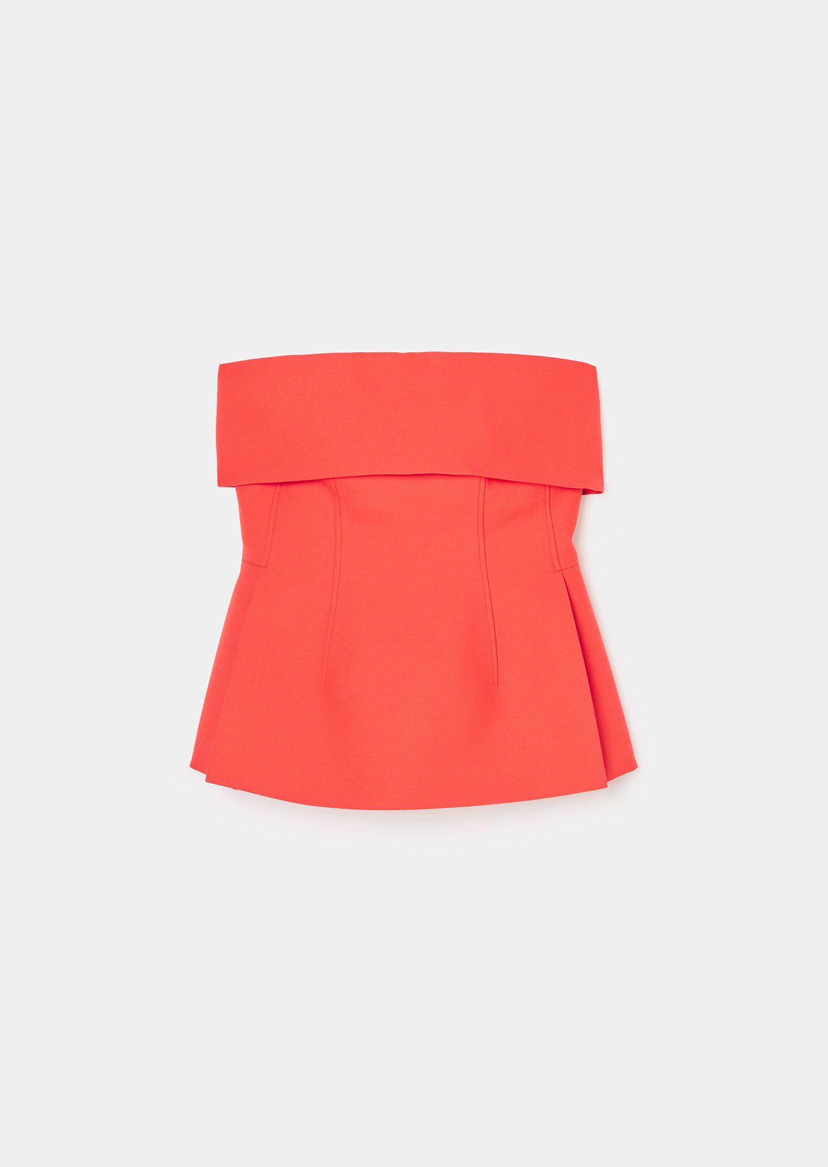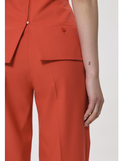 Ce top bustier couleur rouge coquelicot en toile tailleur possède une coupe près du corps cintrée à la taille et un large revers à la poitrine. Il a de petites fentes en bas et une poche passepoilée au dos. Fermeture par un zip invisible au dos. Ultra féminin, on le porte avec le pantalon Poupee assorti.
