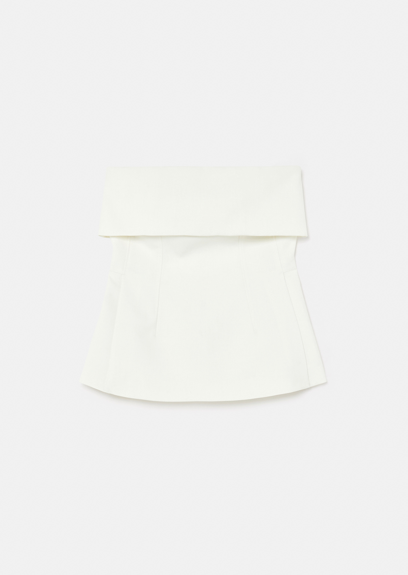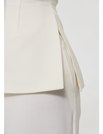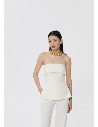 Ce top bustier écru en toile tailleur possède une coupe près du corps cintrée à la taille et un large revers à la poitrine. Il a de petites fentes en bas et une poche passepoilée au dos. Fermeture par un zip invisible au dos. Ultra féminin, on le porte avec le pantalon Poupee assorti.