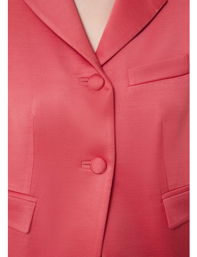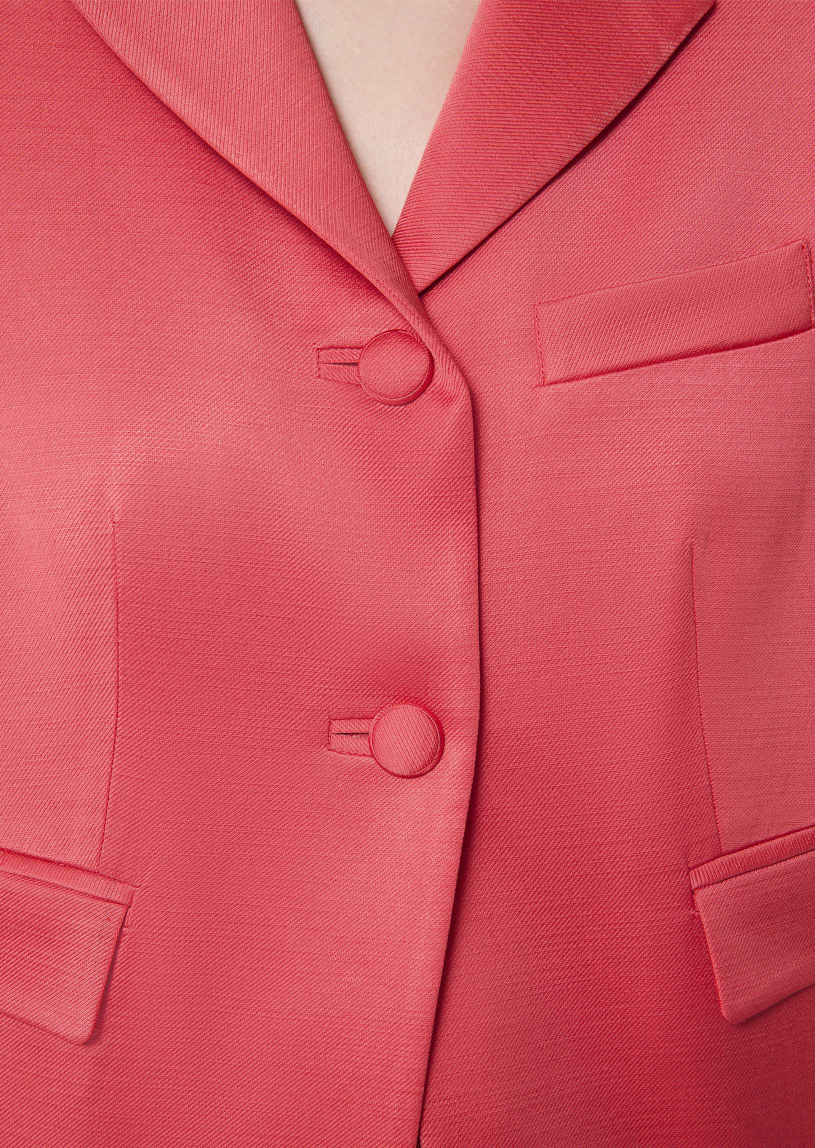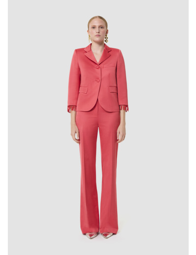 Cette veste courte couleur rouge coquelicot satinée possède de manches 3/4 et une coupe courte légèrement cintrée à la poitrine. Elle a des poches à rabat aux côtés et une poche passepoilée à la poitrine. Elle se ferme grâce à une simple boutonnage de boutons recouverts ton sur ton. La touche so Tara : les franges ton sur ton qui ornent le bas des manches. Optez pour le total look avec le pantalon Pitt assorti.