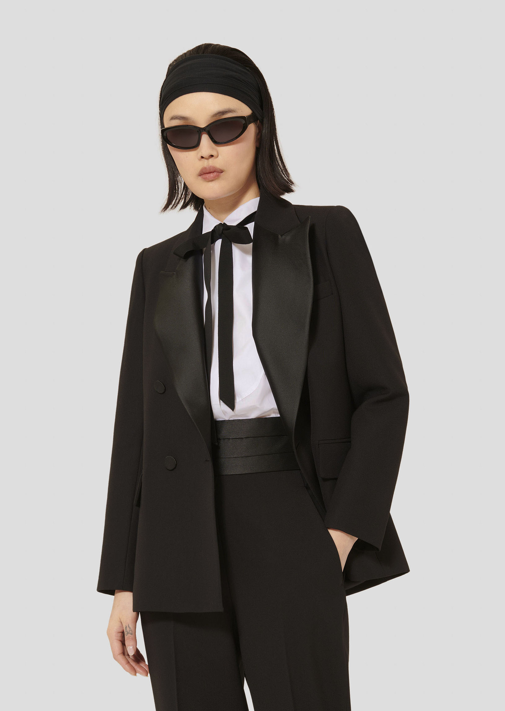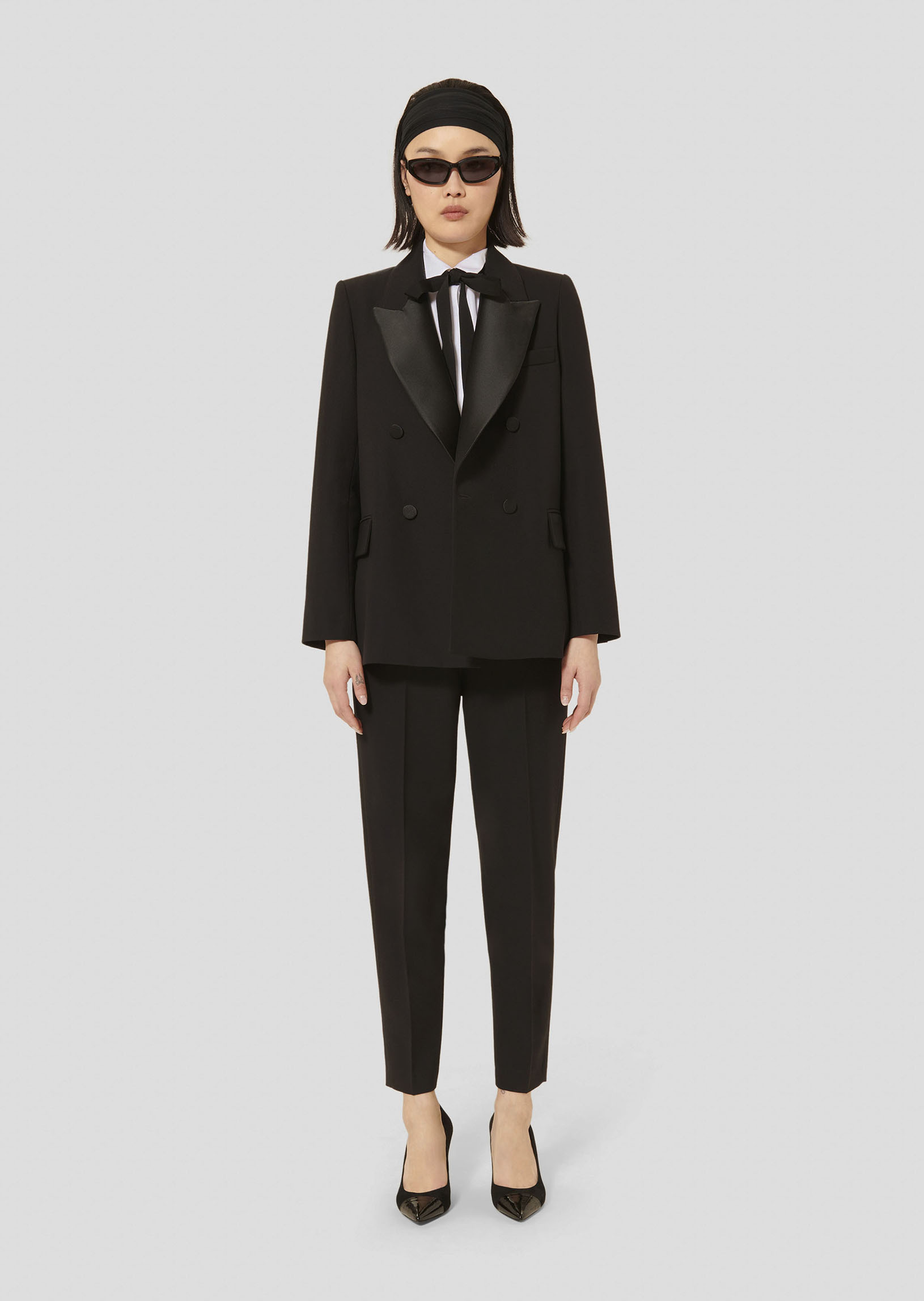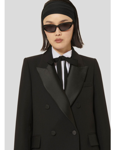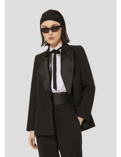 Cette veste tailleur noire en toile, possède une coupe légèrement cintrée à la taille, de longues manches boutonnées aux poignets et de petites épaulettes. Elle a deux grandes poches au-devant et une poche à la poitrine. Elle se ferme au-devant par un double boutonnage ton sur ton.
