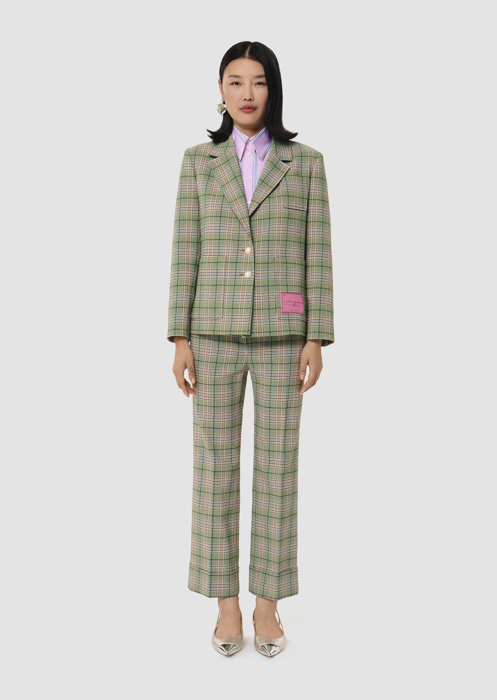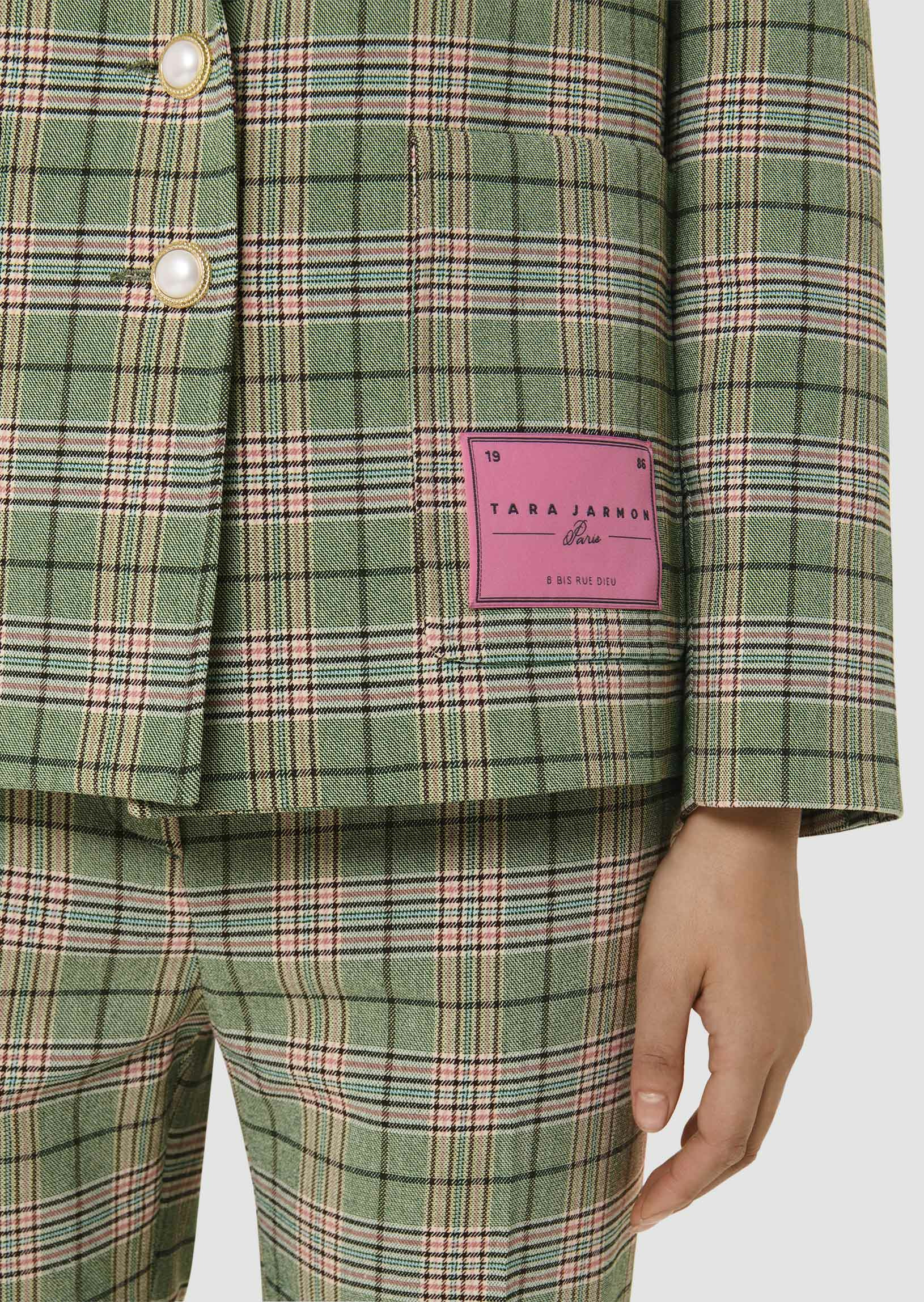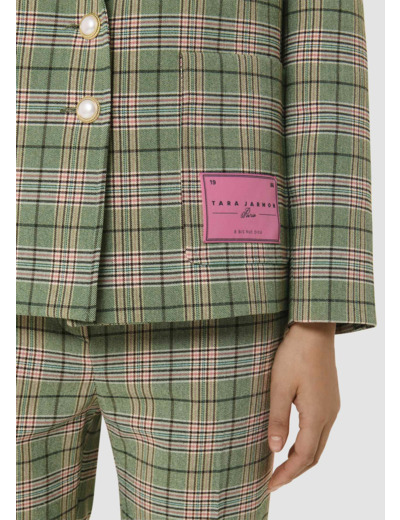 Cette veste de tailleur en tartan couleur vert tilleul possède une coupe droite, des épaulettes et des manches longues boutonnées aux poignets. Elle se ferme par un simple boutonnage de boutons bijoux nacrés et dorés et a de larges poches plaquées aux côtés. Petit twist, elle est marquée de l'étiquette de la maison Tara Jarmon au bas gauche. Pour un total look tailleur ultra preppy, on la porte avec le pantalon Phill assorti.