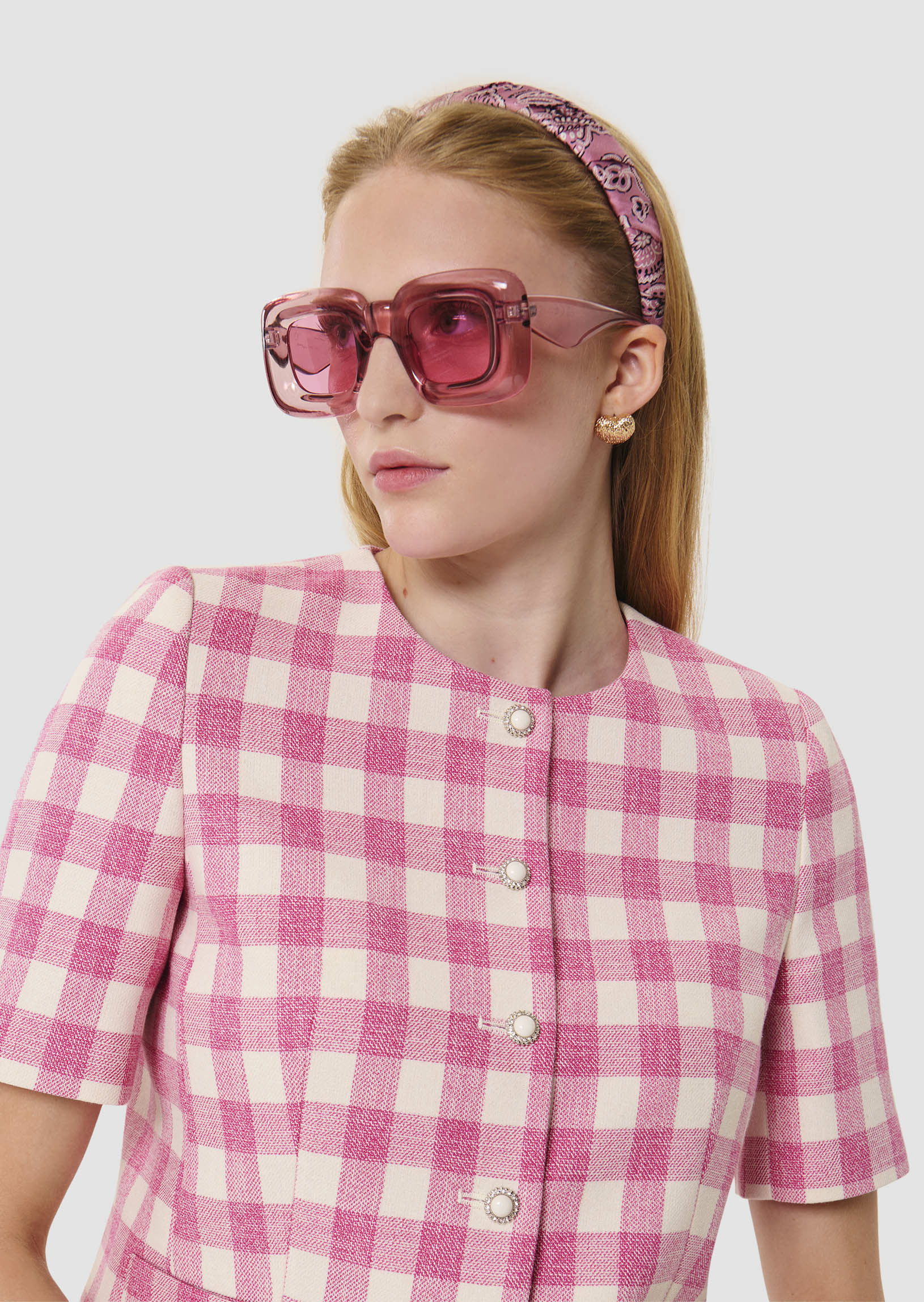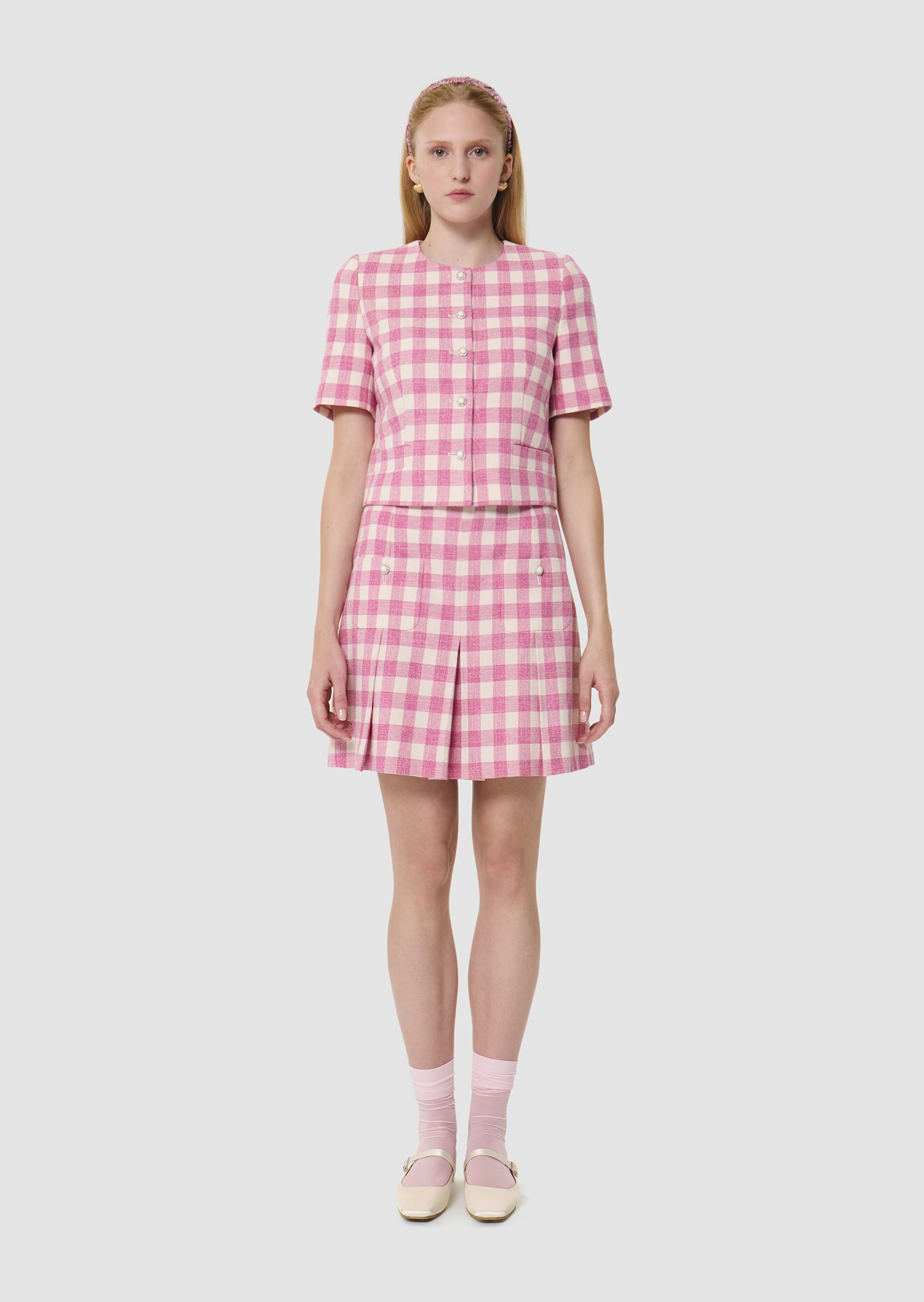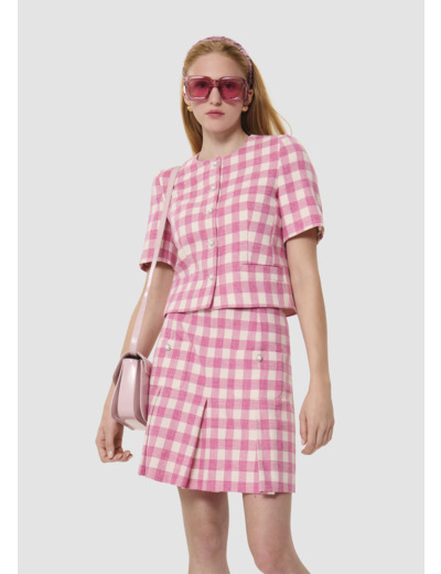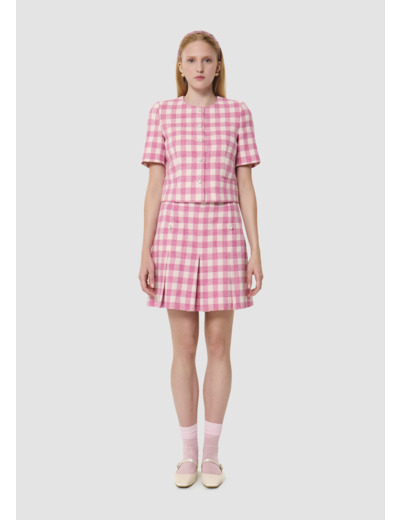 Cette veste courte en vichy écru et rose bonbon possède un col rond, des manches courtes à épaulettes et des poches passepoilées aux côtés. Elle est cintrée et se ferme au devant par des boutons bijoux à strass. Pour un total look ultra preppy, portez-la avec la jupe Josef assortie.