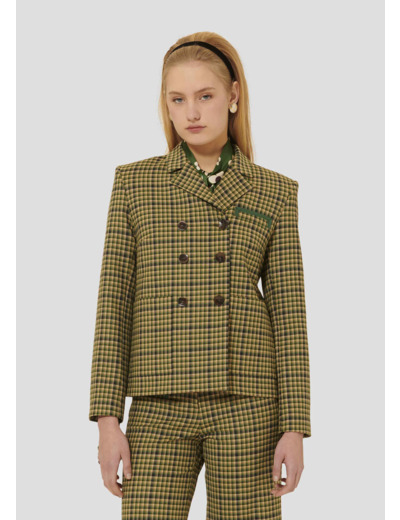 Cette veste tailleur en tartan vert possède une coupe droite, un col à revers, des manches longues boutonnées aux poignets et de petites épaulettes. Elle possède également deux grandes poches aux côtés et une poche passepoilée à la poitrine. Fermeture à triple boutonnage à l'avant. On la porte avec la jupe Joe ou le pantalon Penelope assortis pour un total look élégant.