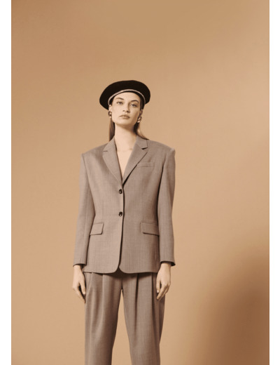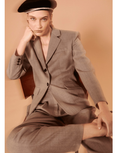 Confectionnée en laine, cette veste couleur brume possède tous les codes classiques d'une veste tailleur indispensable à la garde robe : un col à revers, des poches à rabats aux côtés et une poche passepoilée à la poitrine. Son esprit masculin-féminin réside dans sa coupe droite oversized légèrement cintrée à la taille. Elle se ferme par un simple boutonnage de boutons marrons. On la porte en ensemble tailleur avec le pantalon Philadelphia assorti.