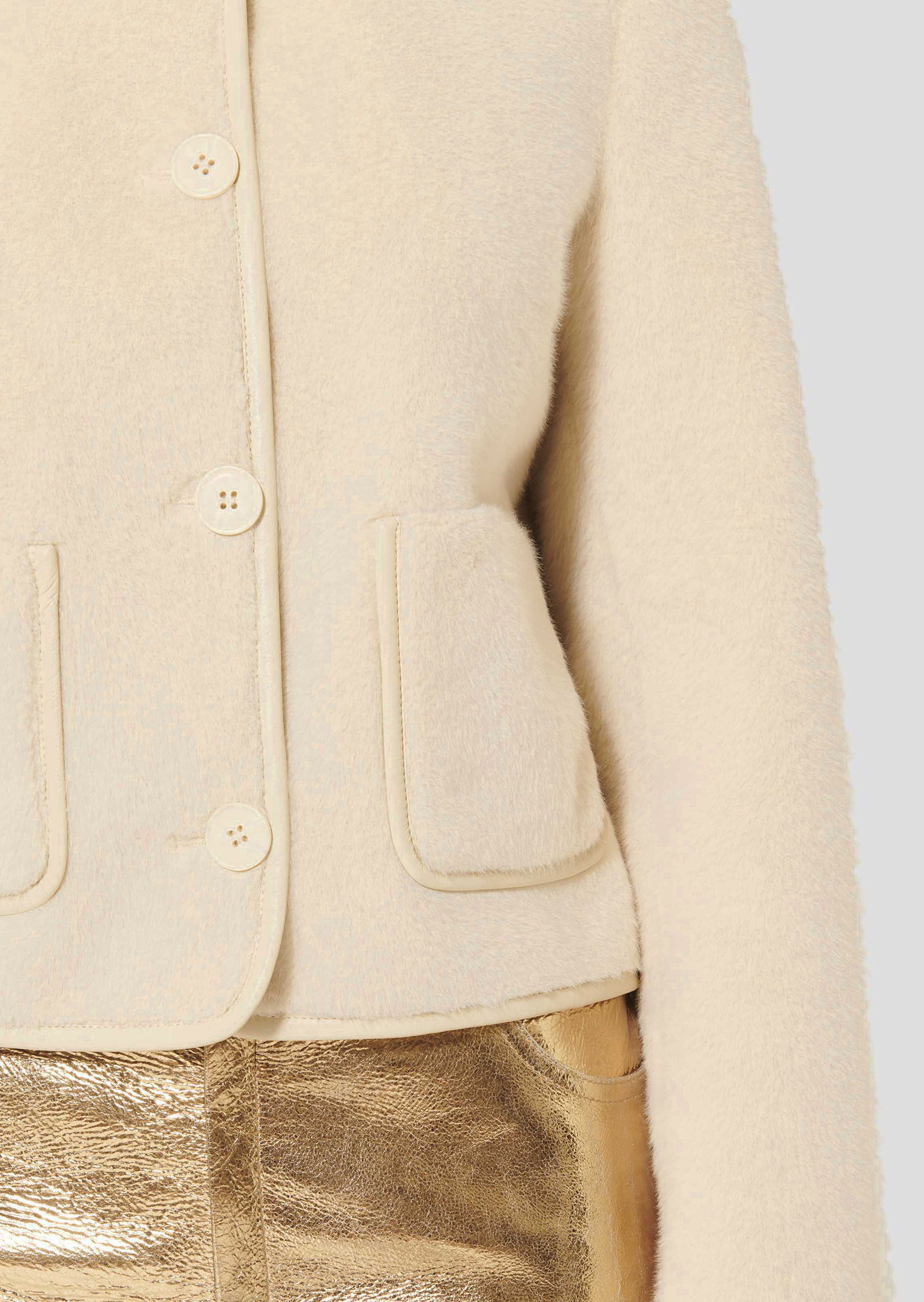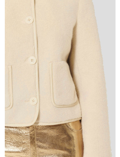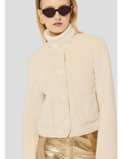Cette veste écrue en fausse fourrure possède des manches longues, une encolure ronde et deux poches aux côtés. Sa coupe est courte et se ferme au-devant par des boutons écrus.