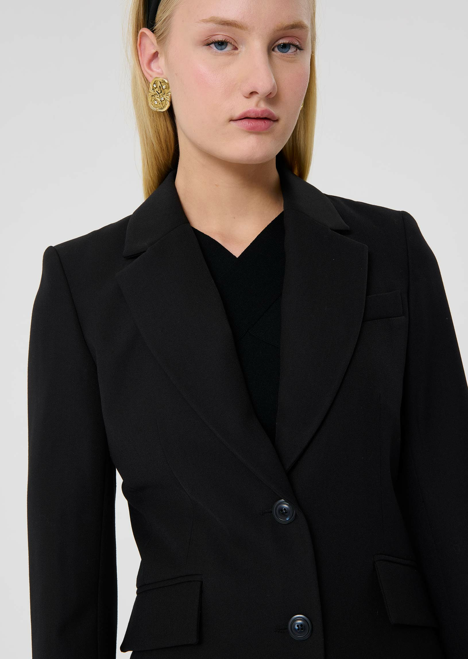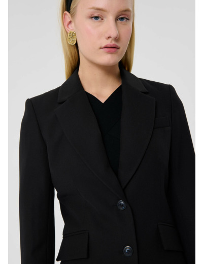 Conçue dans un mélange raffiné de polyester recyclé et de laine vierge, cette veste offre une texture douce et une tenue impeccable. Sa coupe épurée et sa doublure en viscose garantissent un confort optimal, parfait pour accompagner vos looks professionnels ou décontractés. Le noir profond souligne votre style avec sobriété et caractère.