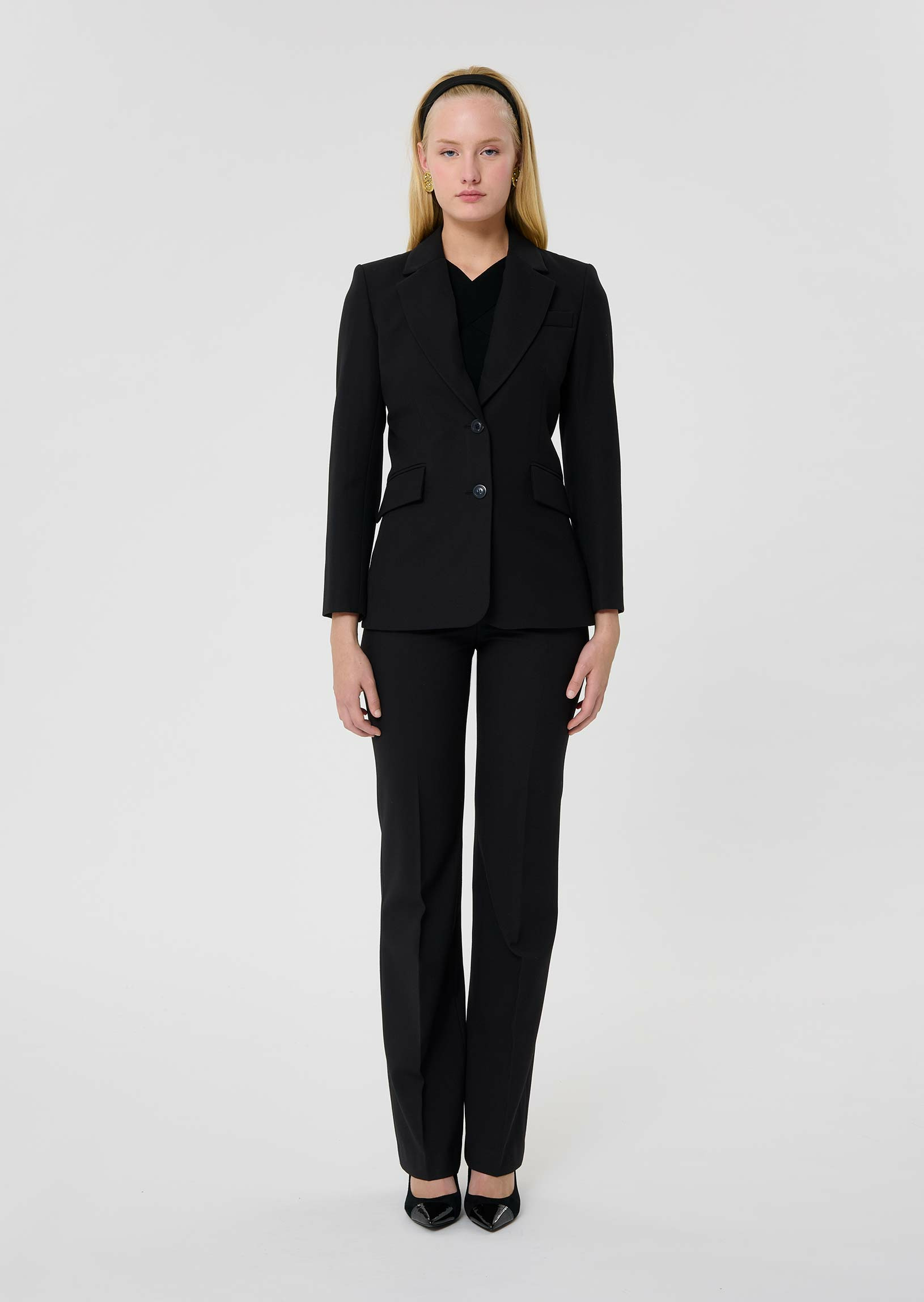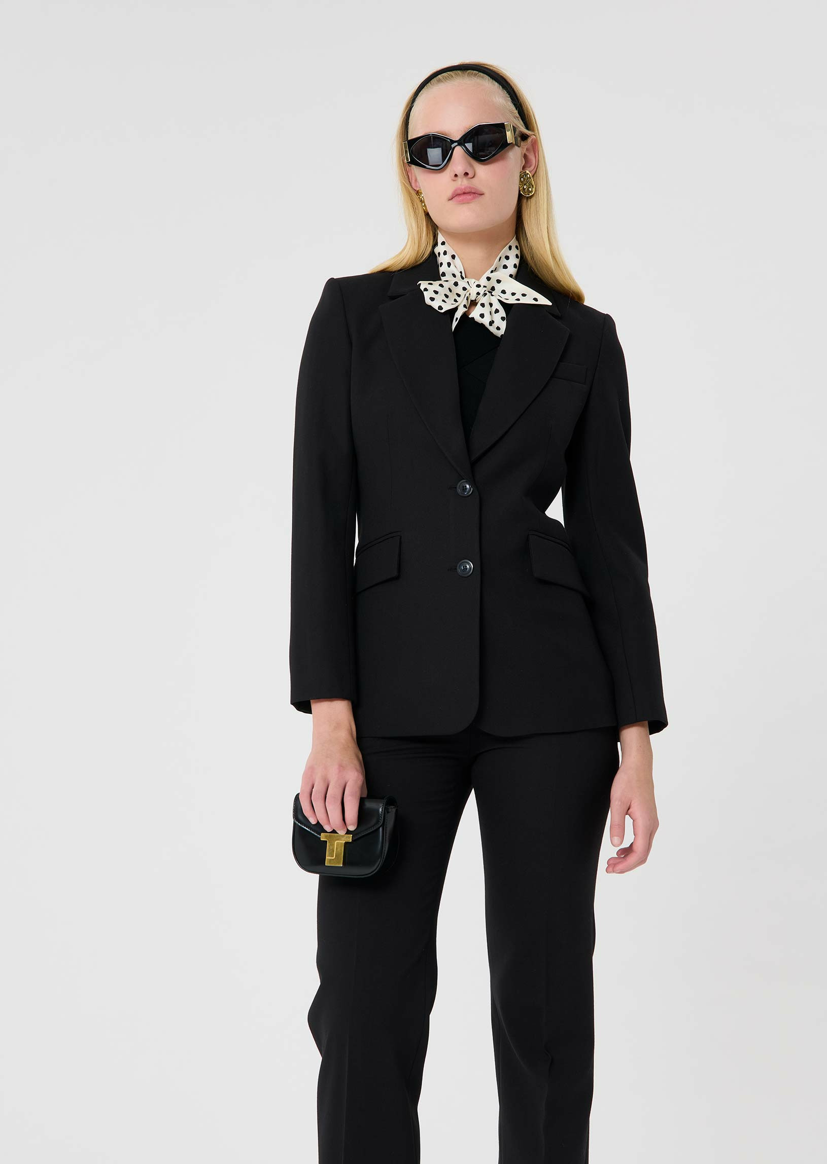 Cette veste tailleur noire en laine possède un col à revers, des boutons aux poignets, des poches à rabats aux côtés et une fausse poche à la poitrine. Elle est cintrée à la taille et sa coupe est structurée par des épaulettes. Elle se ferme par deux boutons ton sur ton à l'avant.