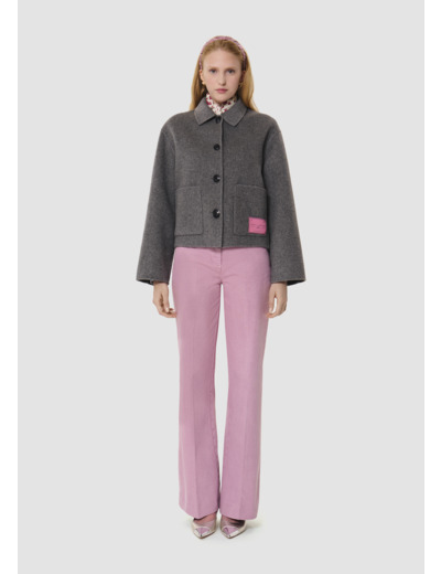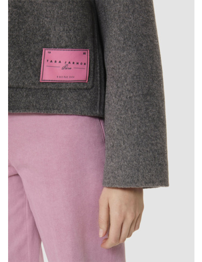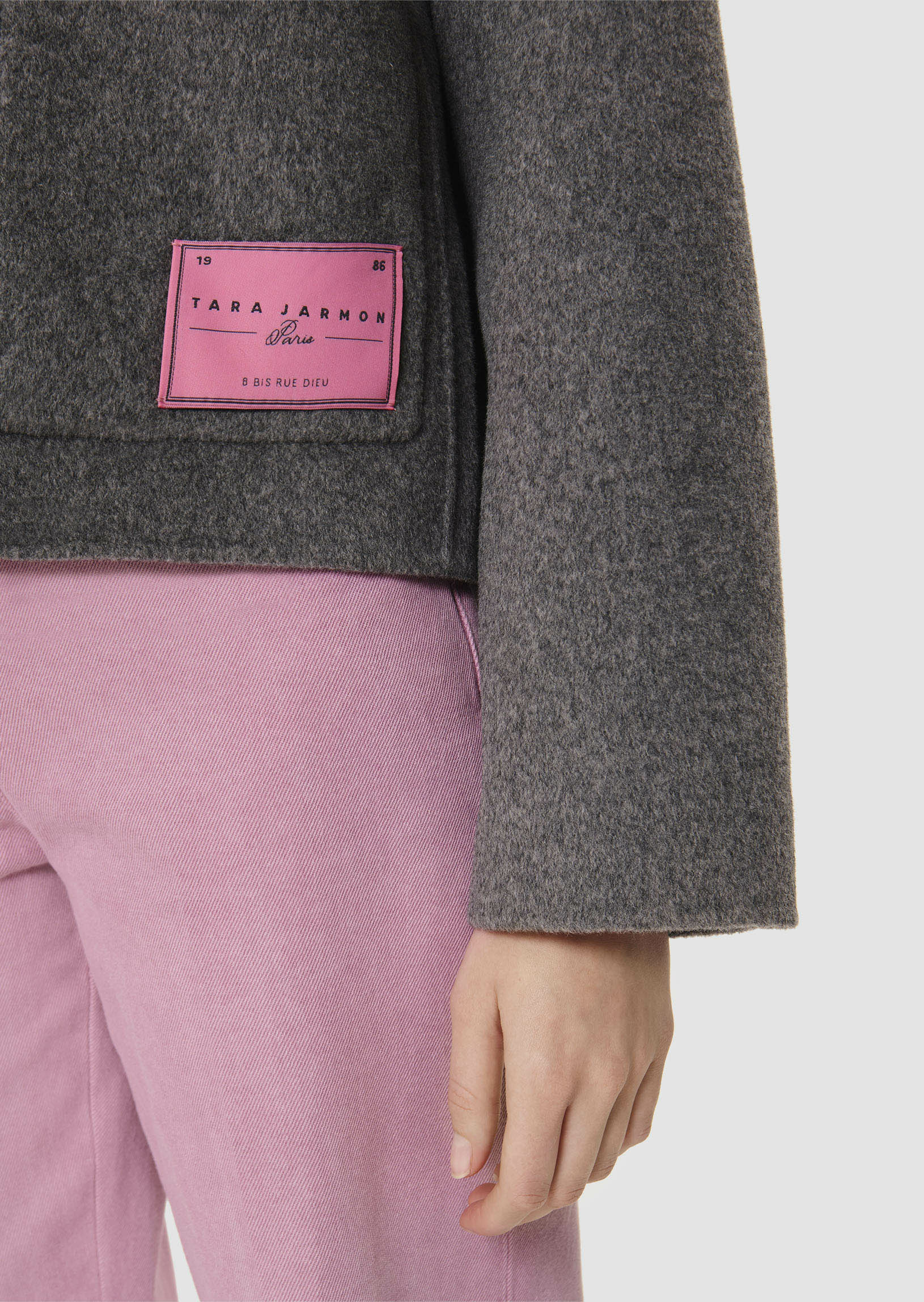 Cette veste courte en laine double face gris chiné possède un col veste classique et des manches longues. Elle a deux larges poches plaquées aux côtés. Sa poche gauche est marquée d’une étiquette rose de la maison Tara Jarmon. Elle se ferme au devant par quatre gros boutons noirs pour une allure preppy et élégante.